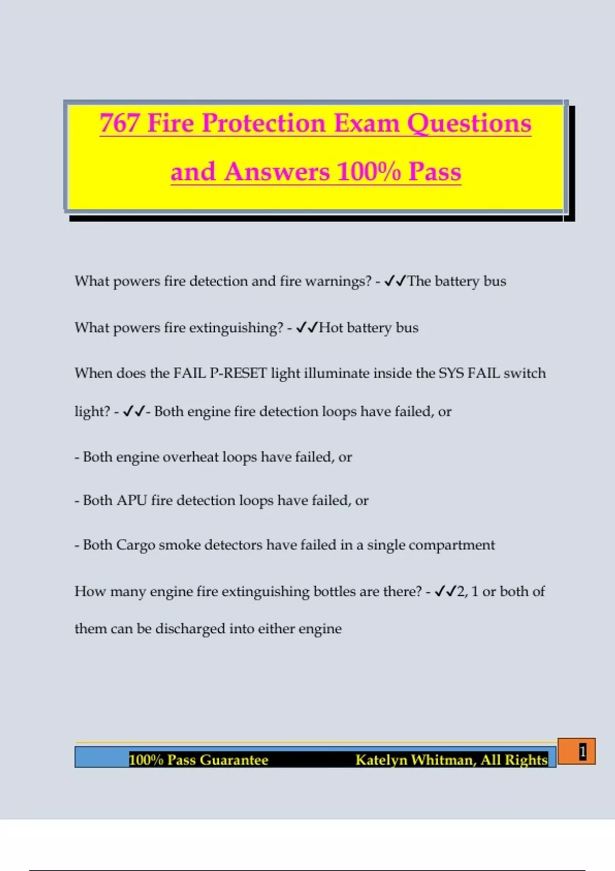767 Fire Protection Exam Questions and Answers 100% Pass What powers fire detection and fire warnings? - The battery bus What powers fire extinguishing? - Hot battery bus When does the FAIL P-RESET light illuminate inside the SYS FAIL switch light? - - Both engine fire detection loops have failed, or - Both engine overheat loops have failed, or - Both APU fire detection loops have failed, or - Both Cargo smoke detectors have failed in a single compartment How many engine fire extinguishing bottles are there? - 2, 1 or both of them can be discharged into either engine 2 100% Pass Guarantee Katelyn Whitman, All Rights Will the engine or APU fire switches work if there isn't a fire signal? - No, a solenoid locks the mechanism to prevent inadvertent usage If the locking solenoid fails to unlock for an engine or APU fire switch, what can you do? - Push the associated fire override switch to unlock the switch. How many fire extinguishing bottles are there for the APU? - 1 (some have 2) What happens with an engine or APU fire extinguisher is used? - The BTL DISCH light illuminates along with an EICAS message What does the cargo compartment detection and protection system consist of? - - 2 photoelectric cell smoke detectors per compartment that use bleed air injectors to draw sampling air through them. - 3 fire extinguisher bottles What does pushing a cargo fire bottle DISCH switch do? - It discharges cargo bottle 1 into the selected compartment, the remaining bottle discharges at a later time and at a reduced rate. 3 100% Pass Guarantee Katelyn Whitman, All Rights What are the indications of an engine fire? - - Master warning bell + light - Discrete fire light - EICAS Master warning message - Associated fuel control switch illuminates - Associated engine fire switch illuminates What are the indications of an APU fire? - - Mast