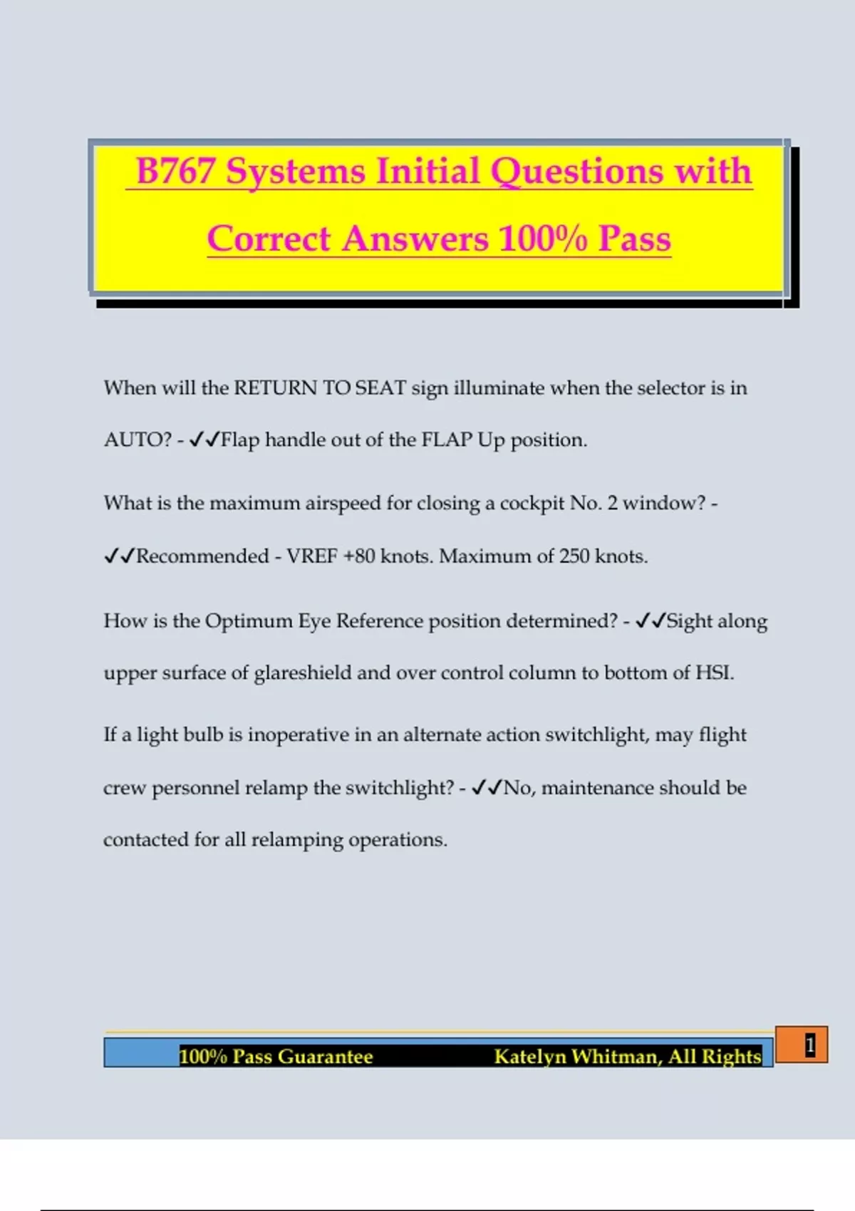 B767 Systems Initial Questions with Correct Answers 100% Pass When will the RETURN TO SEAT sign illuminate when the selector is in AUTO? - Flap handle out of the FLAP Up position. What is the maximum airspeed for closing a cockpit No. 2 window? - Recommended - VREF +80 knots. Maximum of 250 knots. How is the Optimum Eye Reference position determined? - Sight along upper surface of glareshield and over control column to bottom of HSI. If a light bulb is inoperative in an alternate action switchlight, may flight crew personnel relamp the switchlight? - No, maintenance should be contacted for all relamping operations. 2 100% Pass Guarantee Katelyn Whitman, All Rights When the LT OVRD switch is selected ON, what is the result? - Captain's, First Officer's, and center instrument panel floodlights, forward and aft dome lights illuminate. Which EICAS computer is normally controlling the primary and secondary screens when the computer selector is in AUTO? - Left. How many events may be recorded manually with the EVENT RECORD switch? - Only the last recorded event. How is a warning presented on the primary EICAS screen? - Red text at top of message list. What condition will cause a siren to sound? - Overspeed warning, cabin pressure 10,000 feet, autopilot disconnect, takeoff config warning, landing config warning, main cargo door not closed, or latched, or locked. How can an advisory be differentiated from a caution? - Both are amber (yellow), cautions are left justified, and you will hear the beeper. Advisory messages are indented one space from cautions on the primary EICAS screen, there is no audio alert for an advisory level message. 3 100% Pass Guarantee Katelyn Whitman, All Rights What indicates more than one page of messages is available, and how would the pilot page through the messages? - The descriptor, Page 1 appears on the 11th line; Press Cancel switch to go to next page. True or False? Warning EICAS messages are cancelled in the same manner as the caution messages. - False. The problem must be corrected to remove warning messages. During which portion of the flight is the fire bell and master warning light inhibited? - Takeoff from nose strut extension until 400' RA or 20 seconds later. What indications show that a new status message is available? - Cyan STATUS cue appears on the upper left corner of the secondary screen. When may status messages be erased? - During preflight