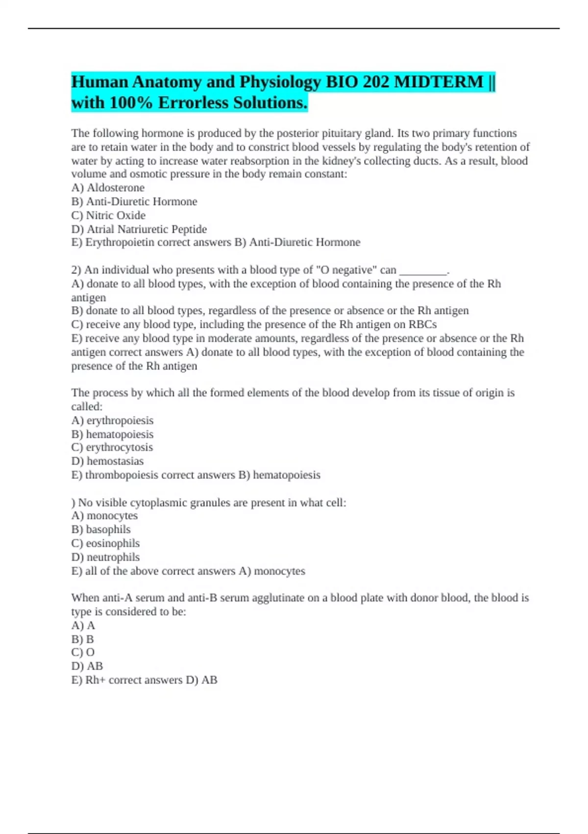 E) Erythropoietin correct answers B) Anti-Diuretic Hormone
