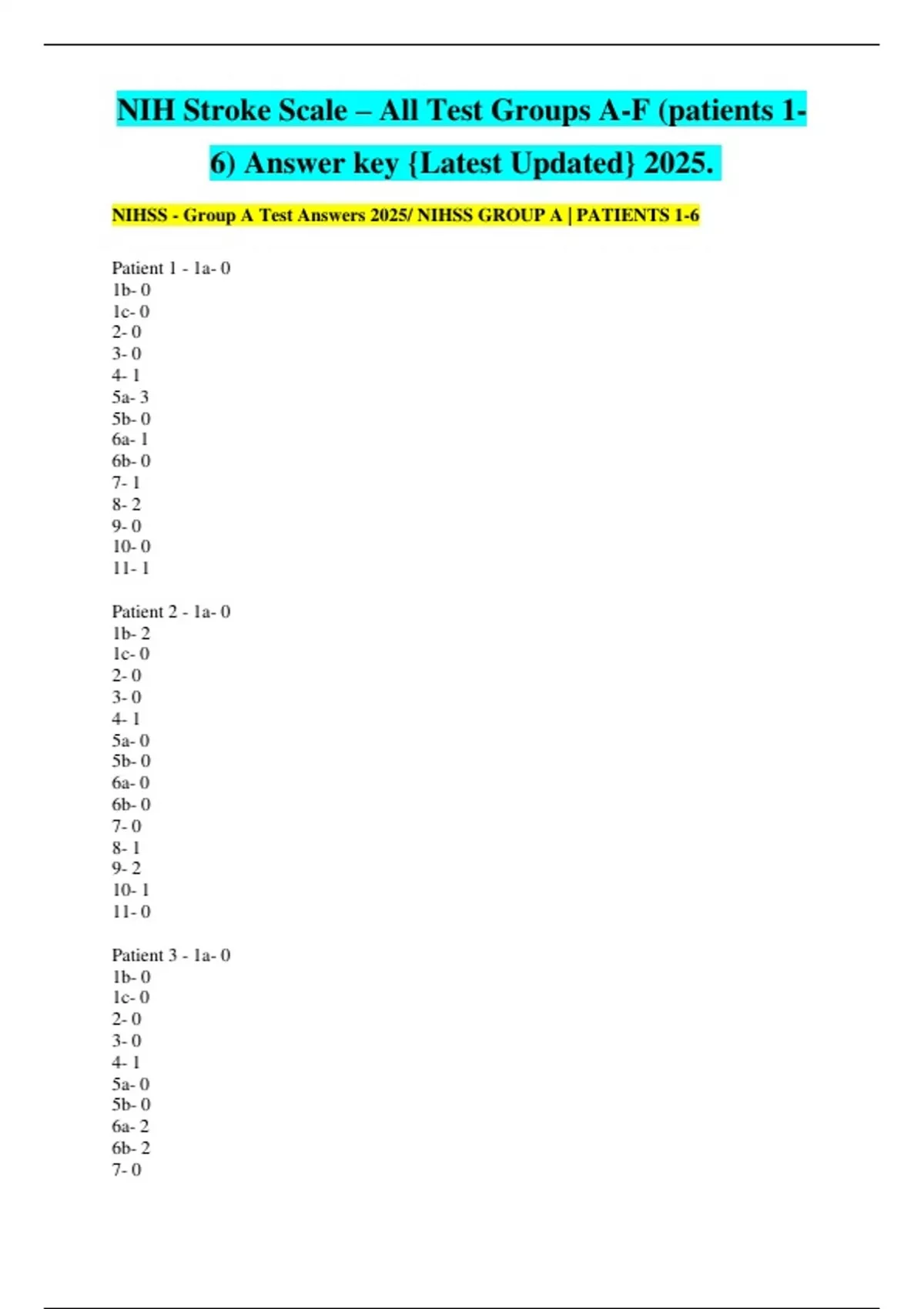 NIHSS - Group A Test Answers 2025/ NIHSS GROUP A | PATIENTS 1-6
