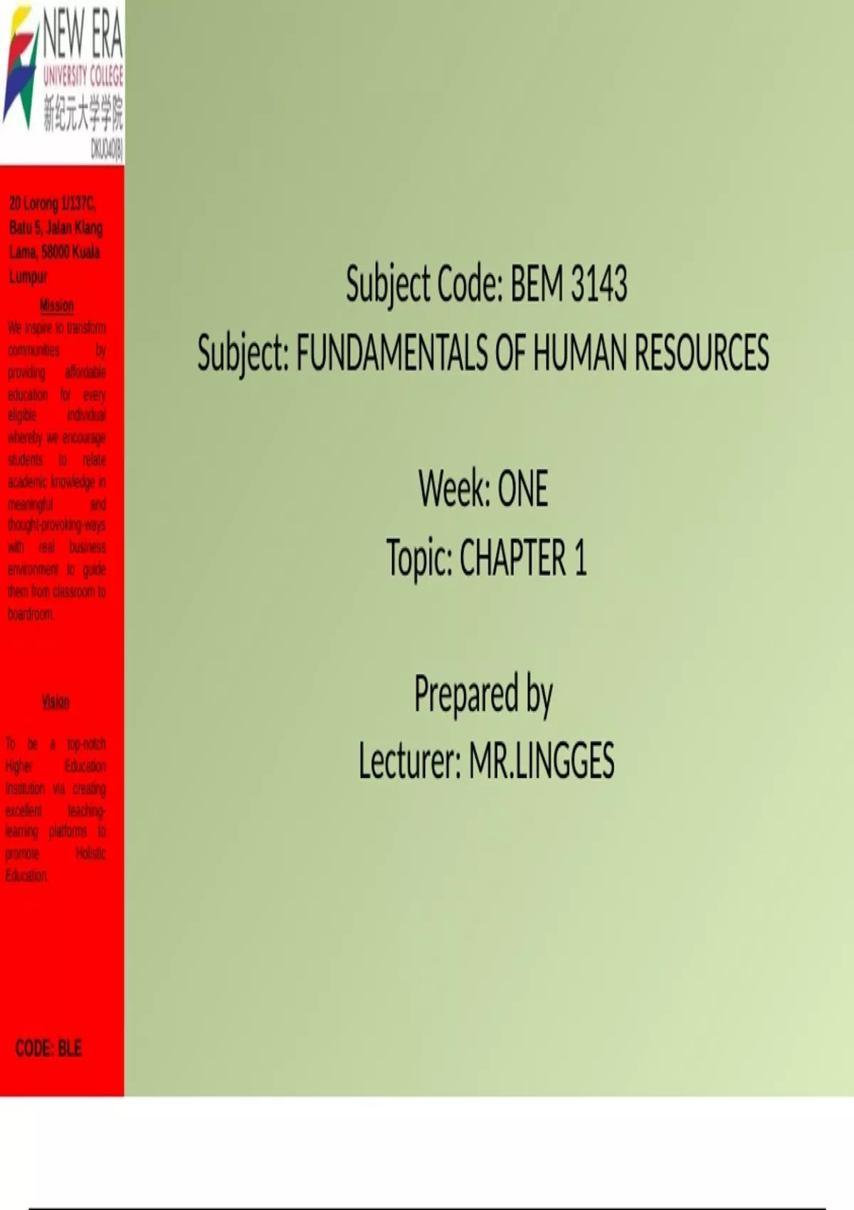 Presentation of 24 pages for the course Introduction of Human Resources Management at Newton International College (Easy to understand)