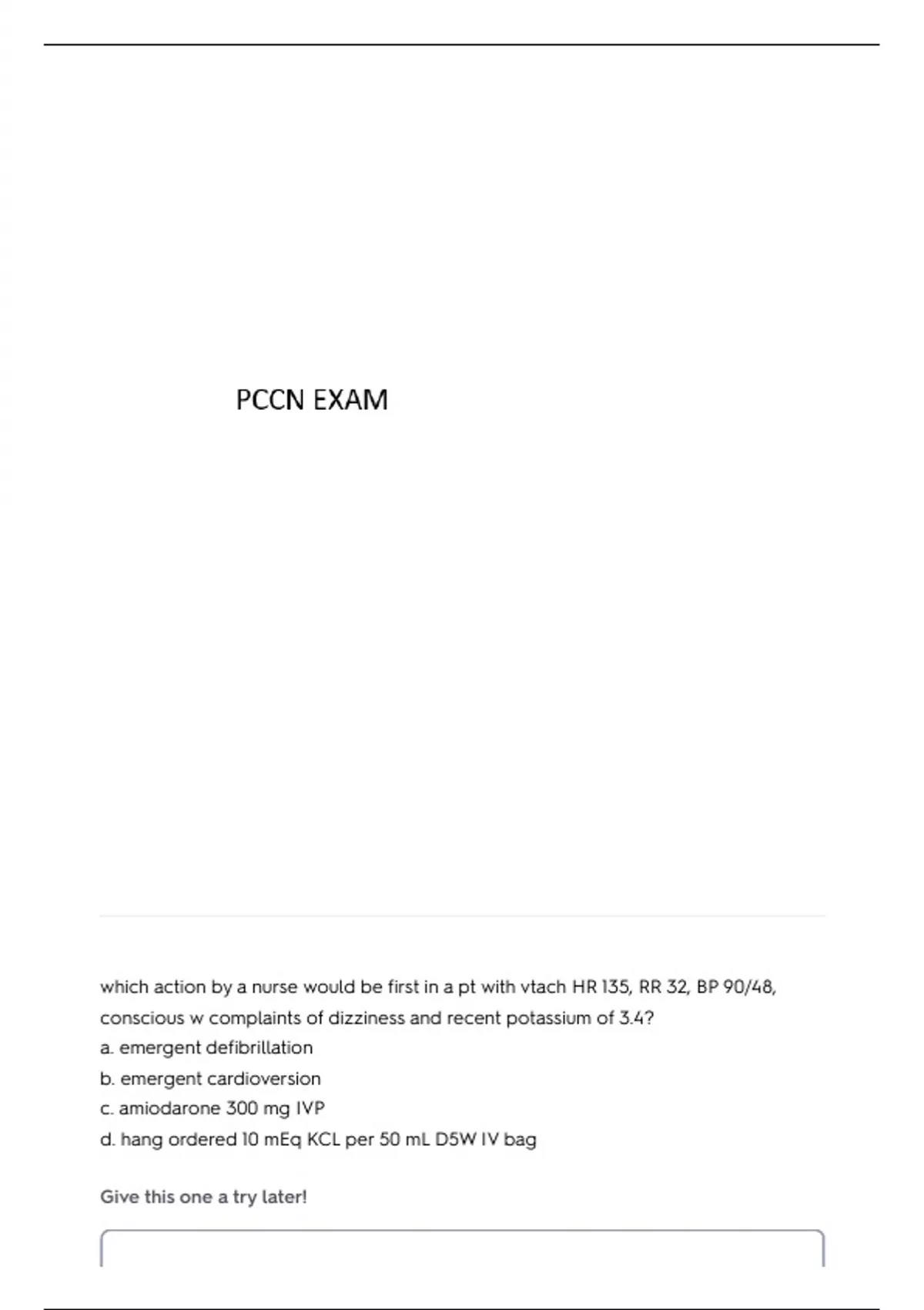 which action by a nurse would be first in a pt with vtach HR 135, RR 32, BP 90/48,