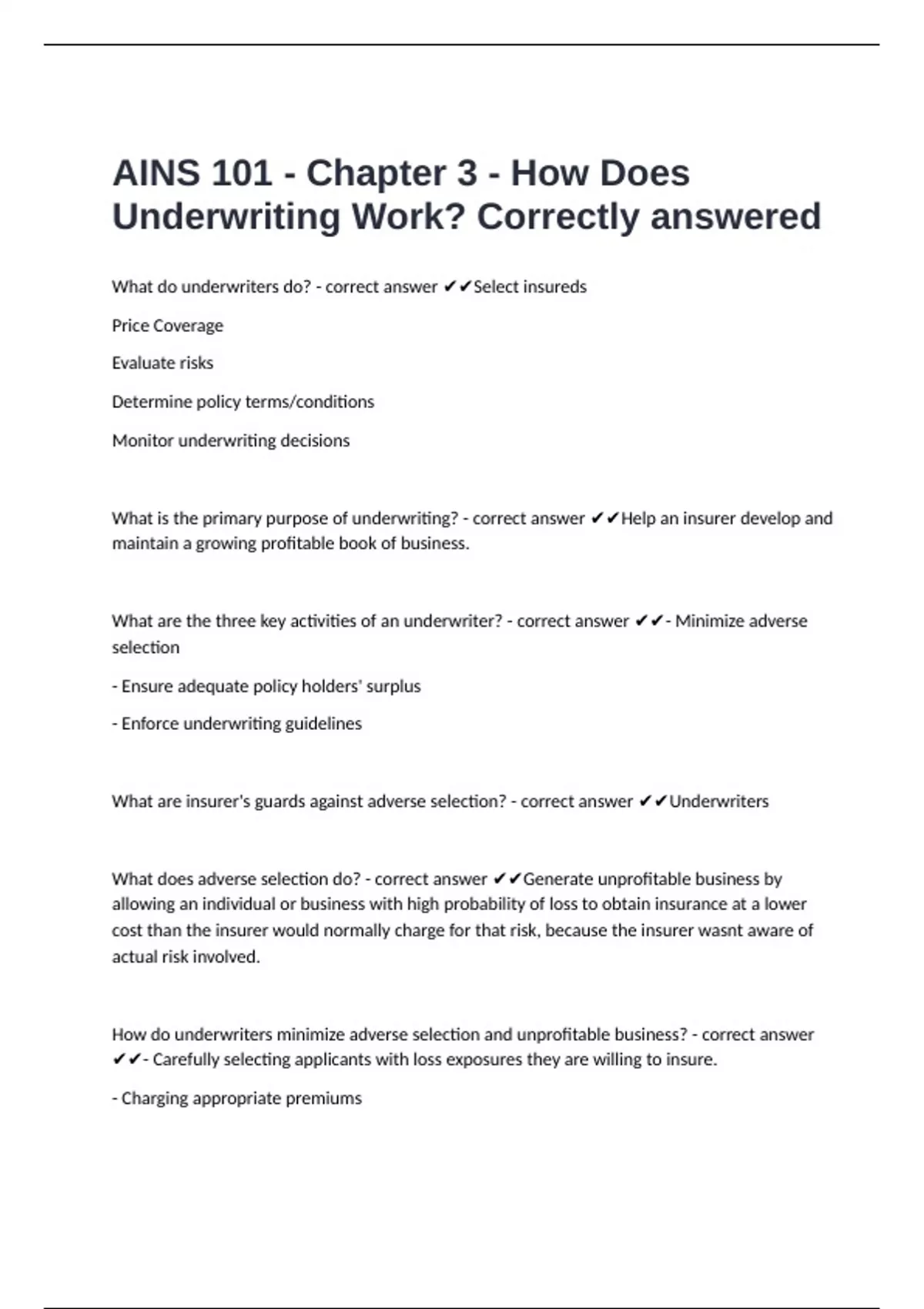 What are the three key activities of an underwriter? - correct answer ✔✔- Minimize adverse