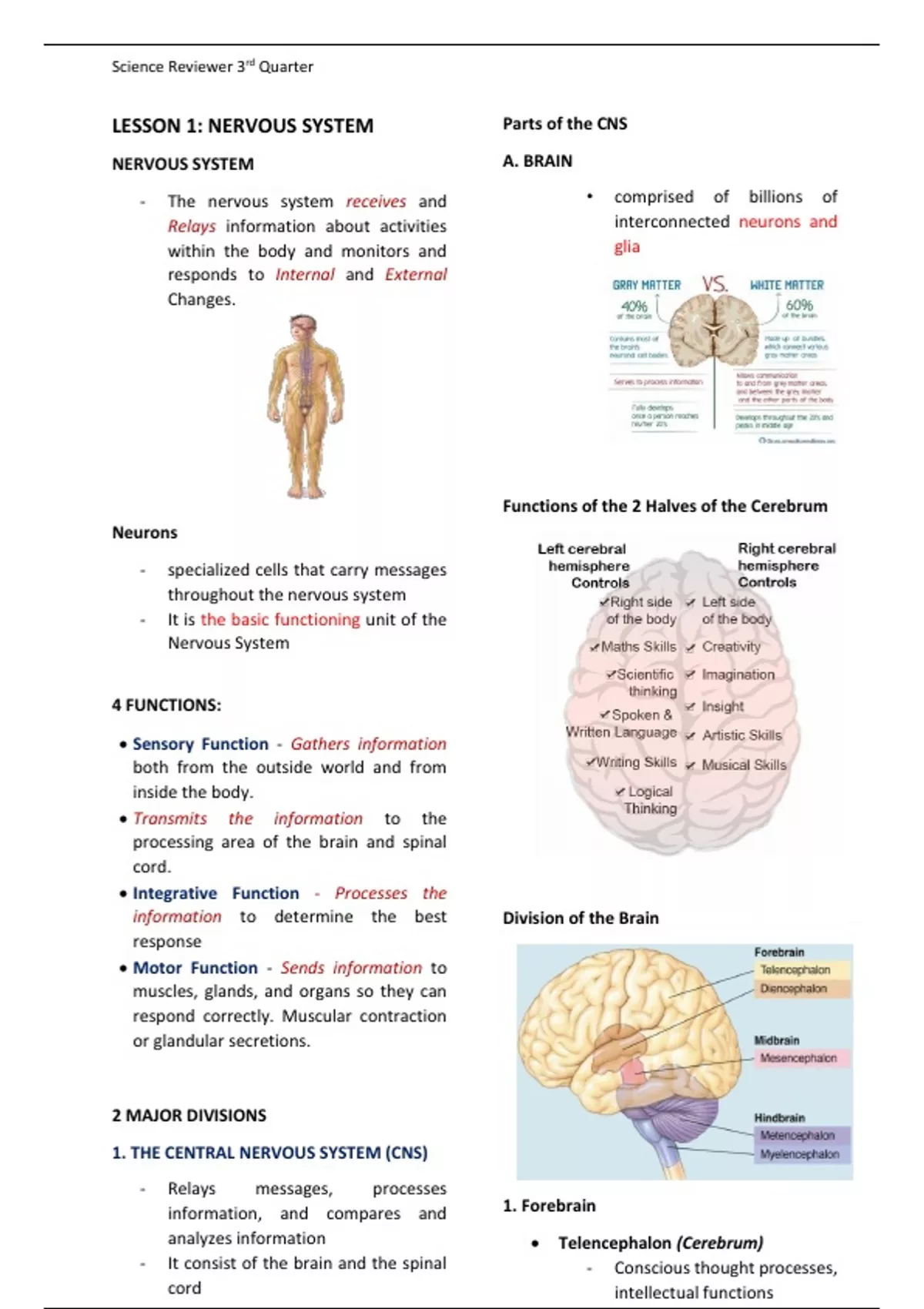 LESSON 1: NERVOUS SYSTEM Parts of the CNS