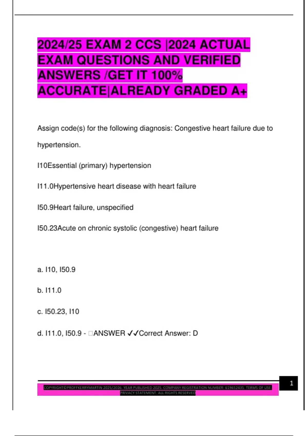 d. I11.0, I50.9 - 🧠ANSWER ✔✔Correct Answer: D