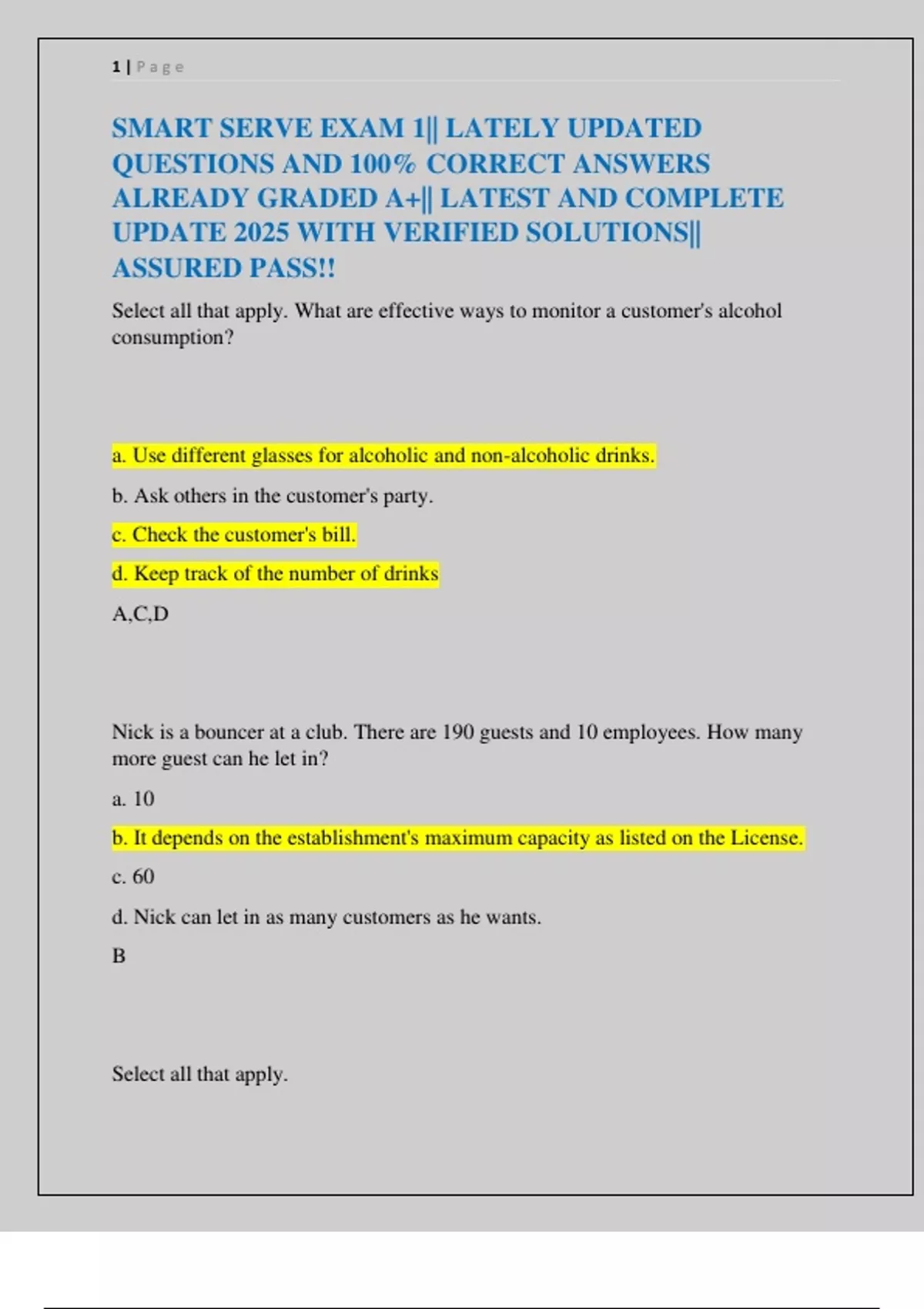 SMART SERVE EXAM 1|| LATELY UPDATED QUESTIONS AND 100% CORRECT ANSWERS ALREADY GRADED A+|| LATEST AND COMPLETE UPDATE 2025 WITH VERIFIED SOLUTIONS|| ASSURED PASS!!