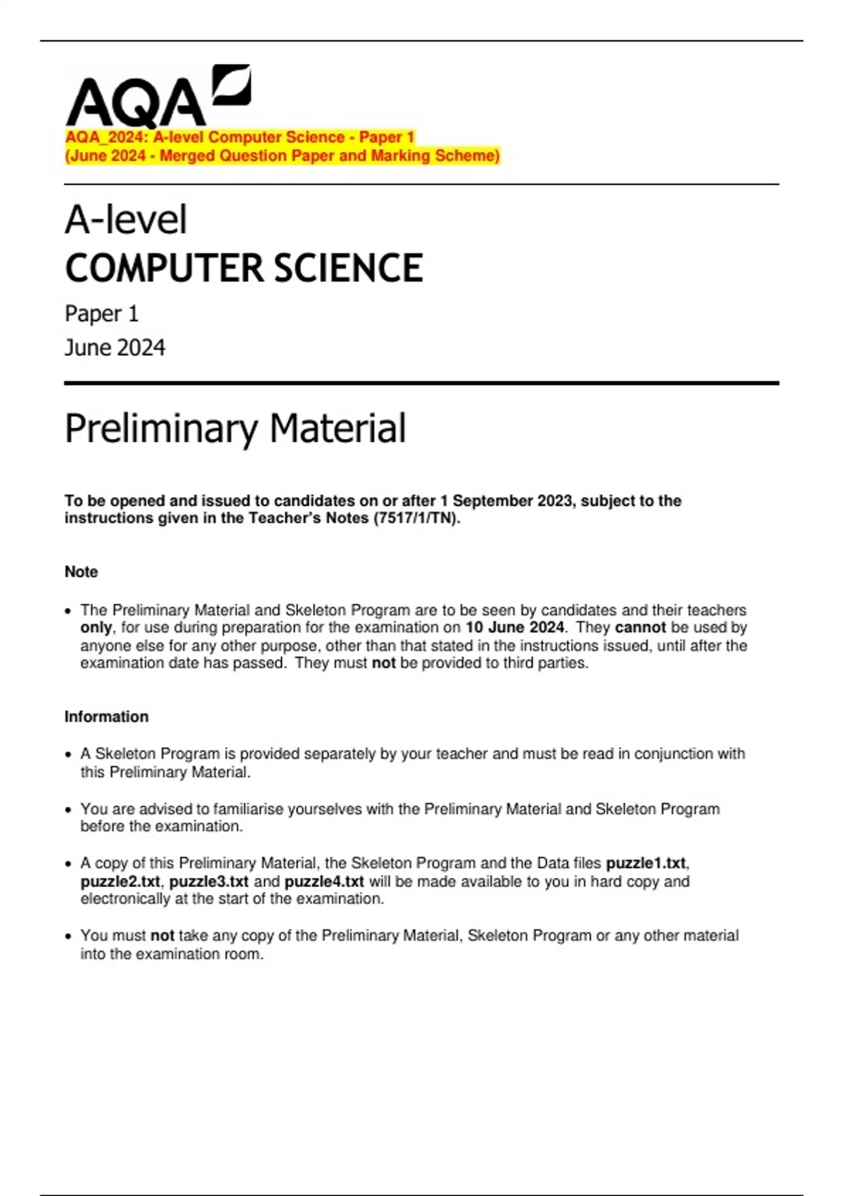,For A-level Computer Science Paper 1 (June 2024), which focuses on Theory of Computer Science, the