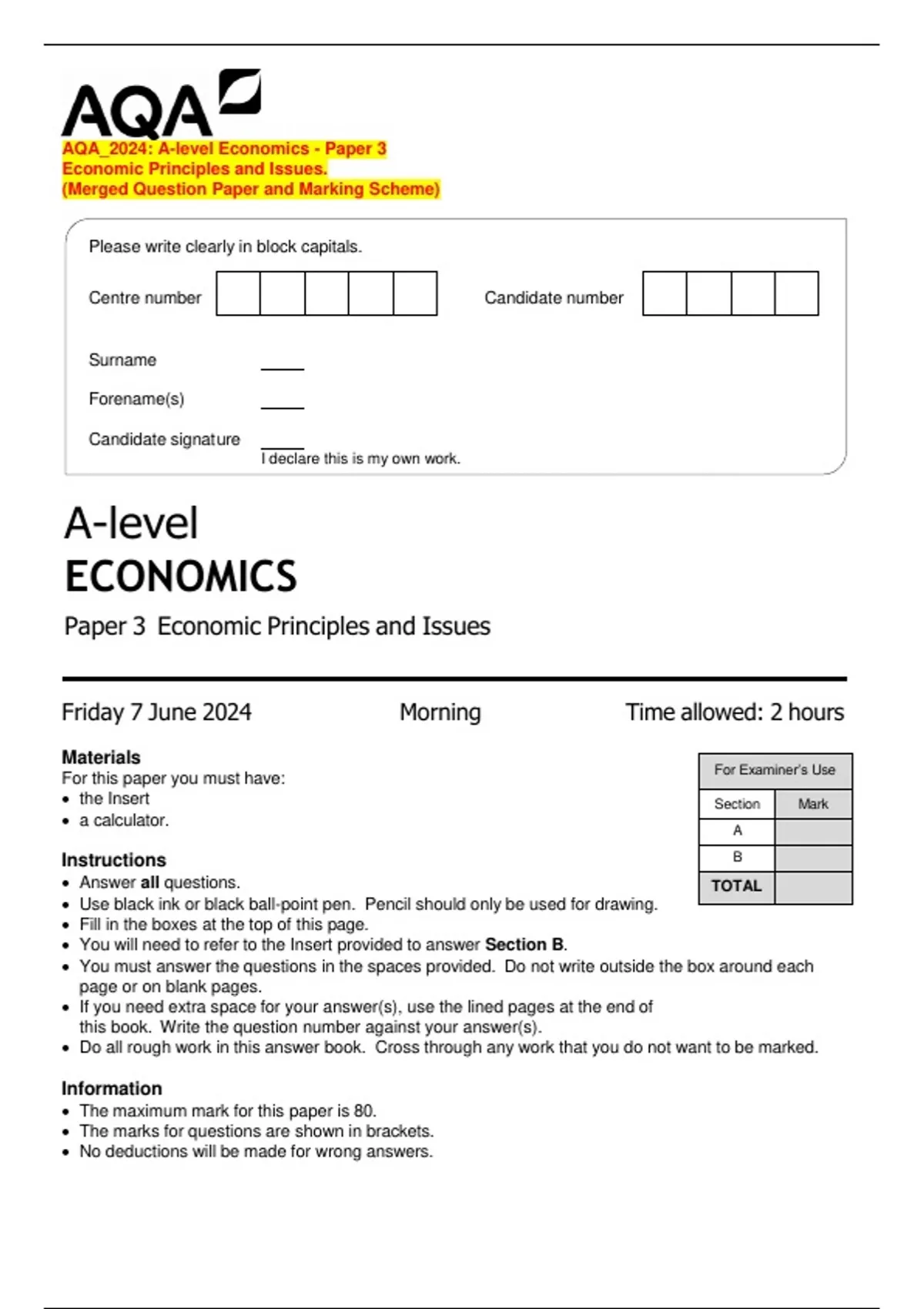 The maximum mark for this paper is 80.