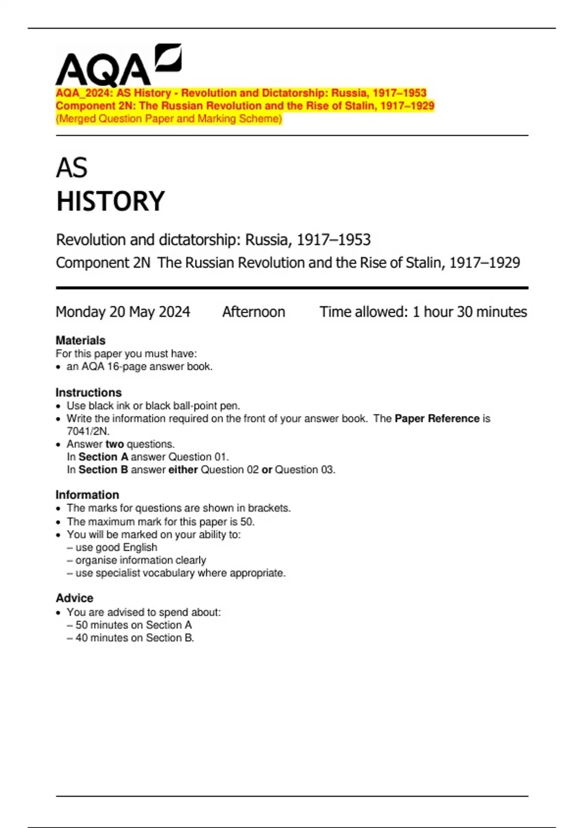 The maximum mark for this paper is 50.