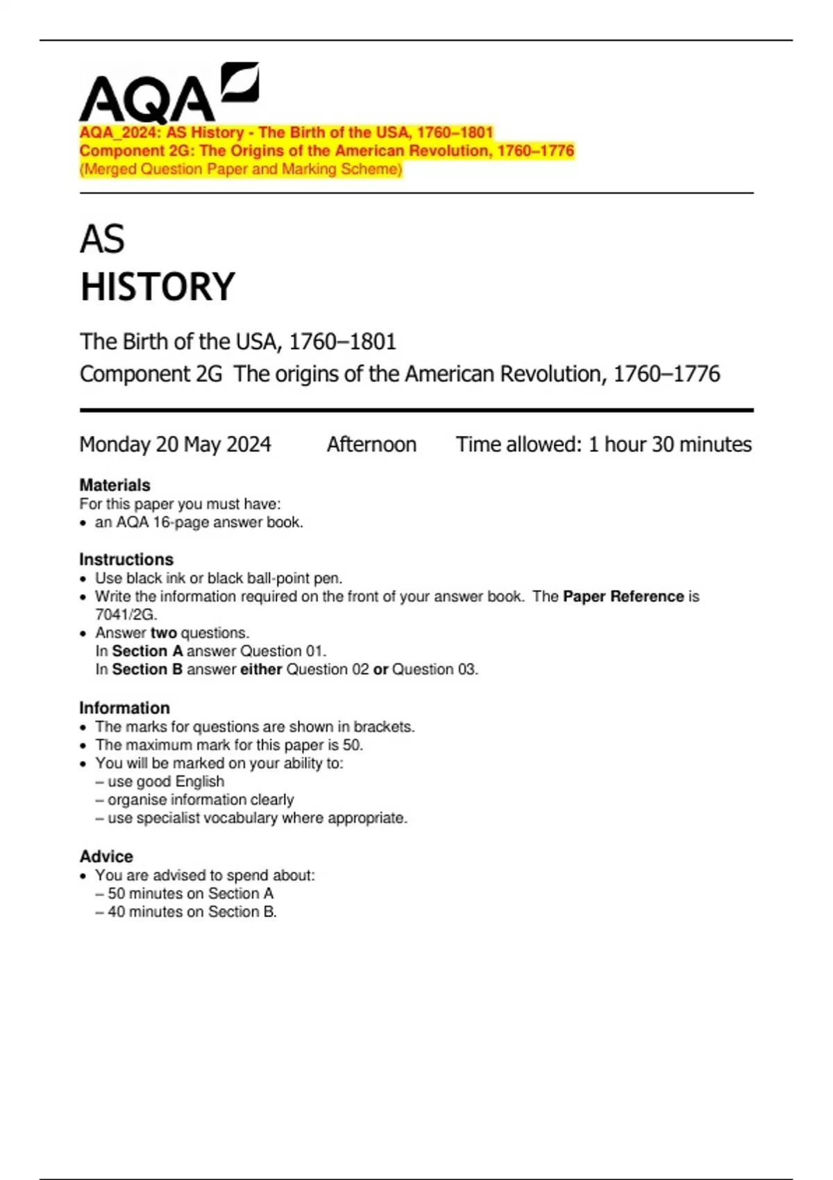 The maximum mark for this paper is 50.