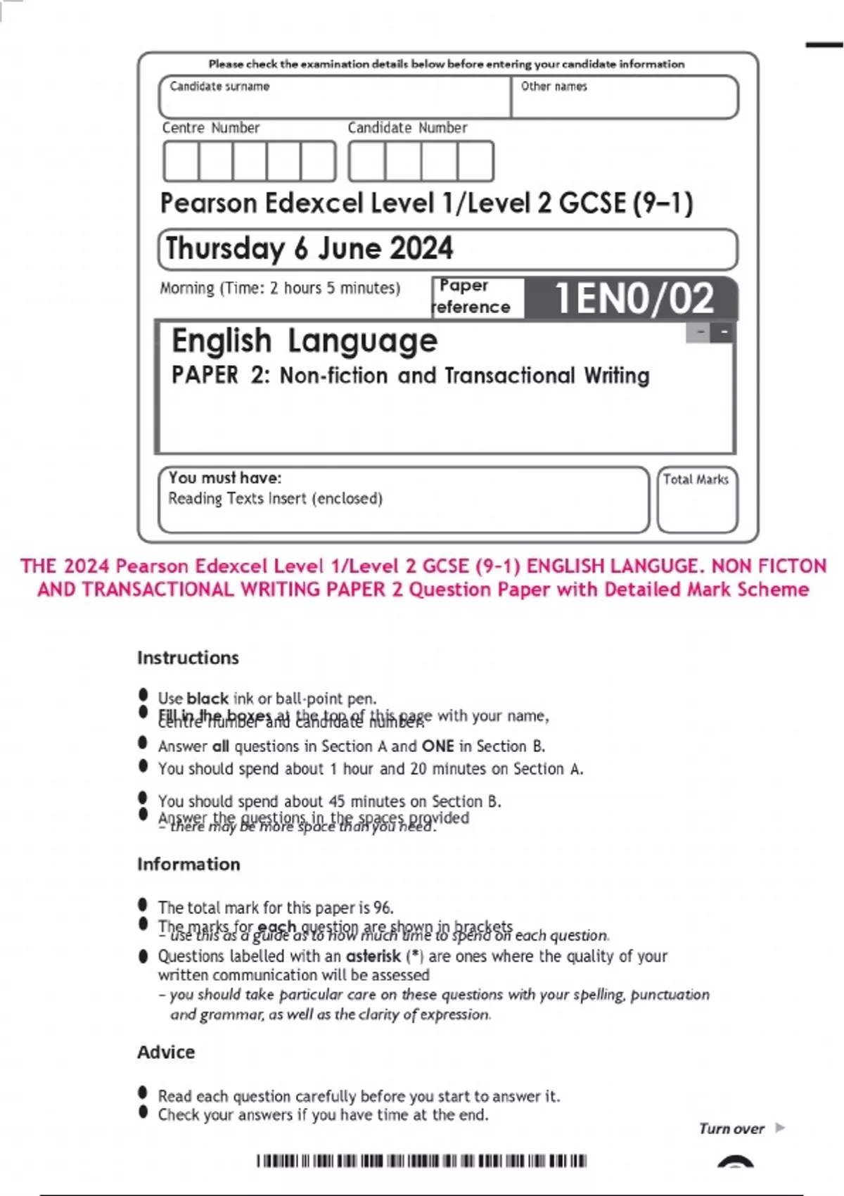 THE 2024 Pearson Edexcel Level 1/Level 2 GCSE (9–1) ENGLISH LANGUGE. NON FICTON AND TRANSACTIONAL WRITING PAPER 2 Question Paper with Detailed Mark Scheme