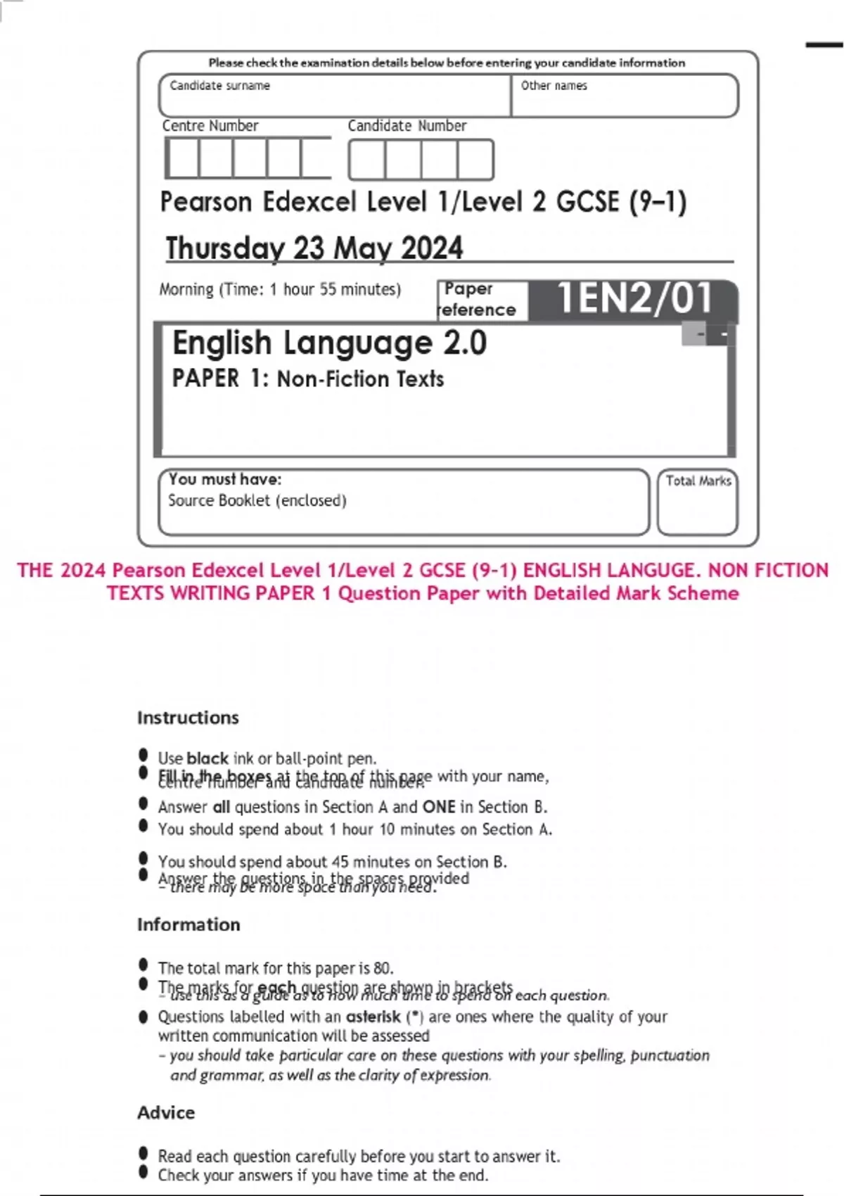 THE 2024 Pearson Edexcel Level 1/Level 2 GCSE (9–1) ENGLISH LANGUGE. NON FICTION TEXTS WRITING PAPER 1 Question Paper with Detailed Mark Scheme