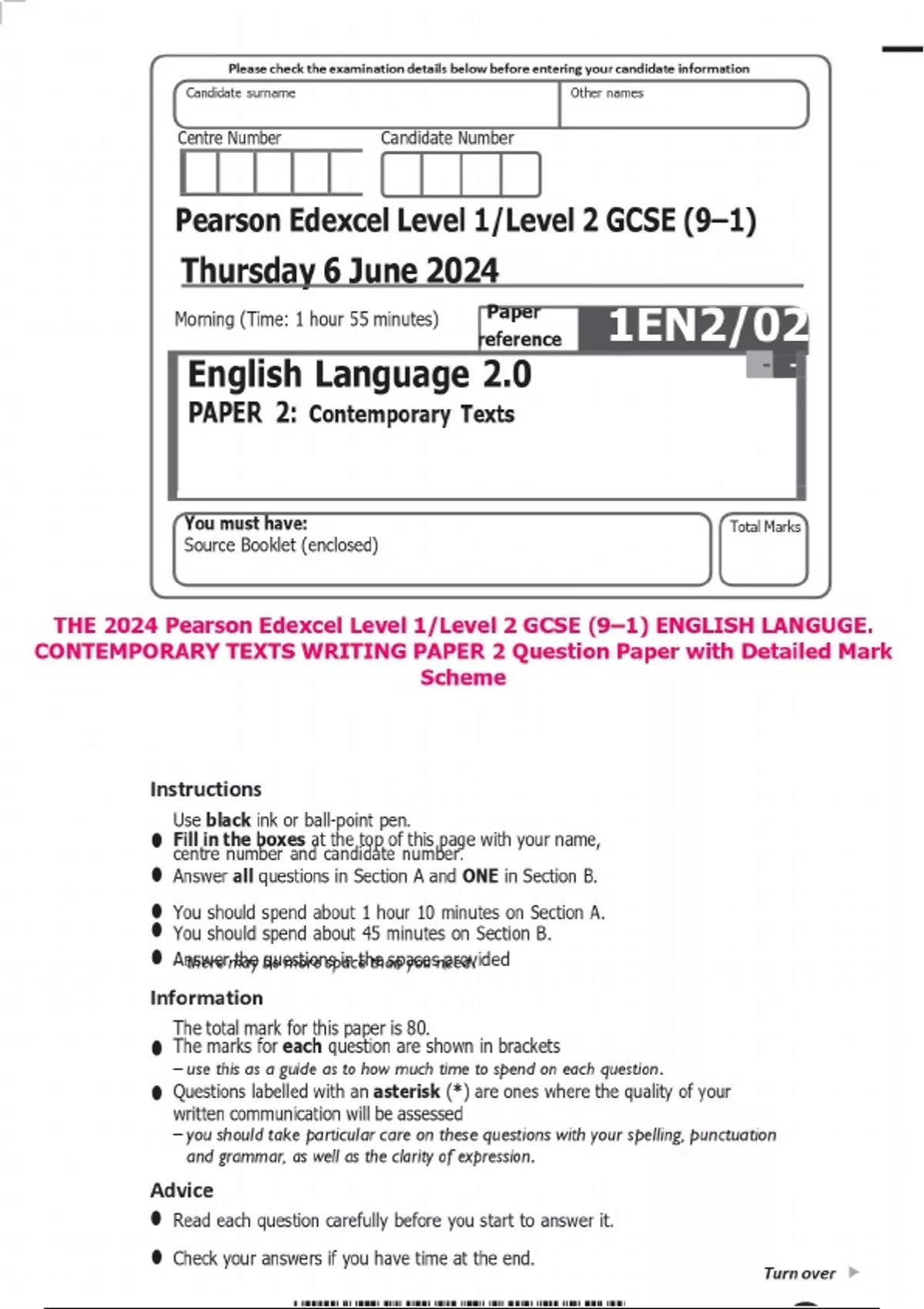 THE 2024 Pearson Edexcel Level 1/Level 2 GCSE (9–1) ENGLISH LANGUGE. CONTEMPORARY TEXTS WRITING PAPER 2 Question Paper with Detailed Mark Scheme