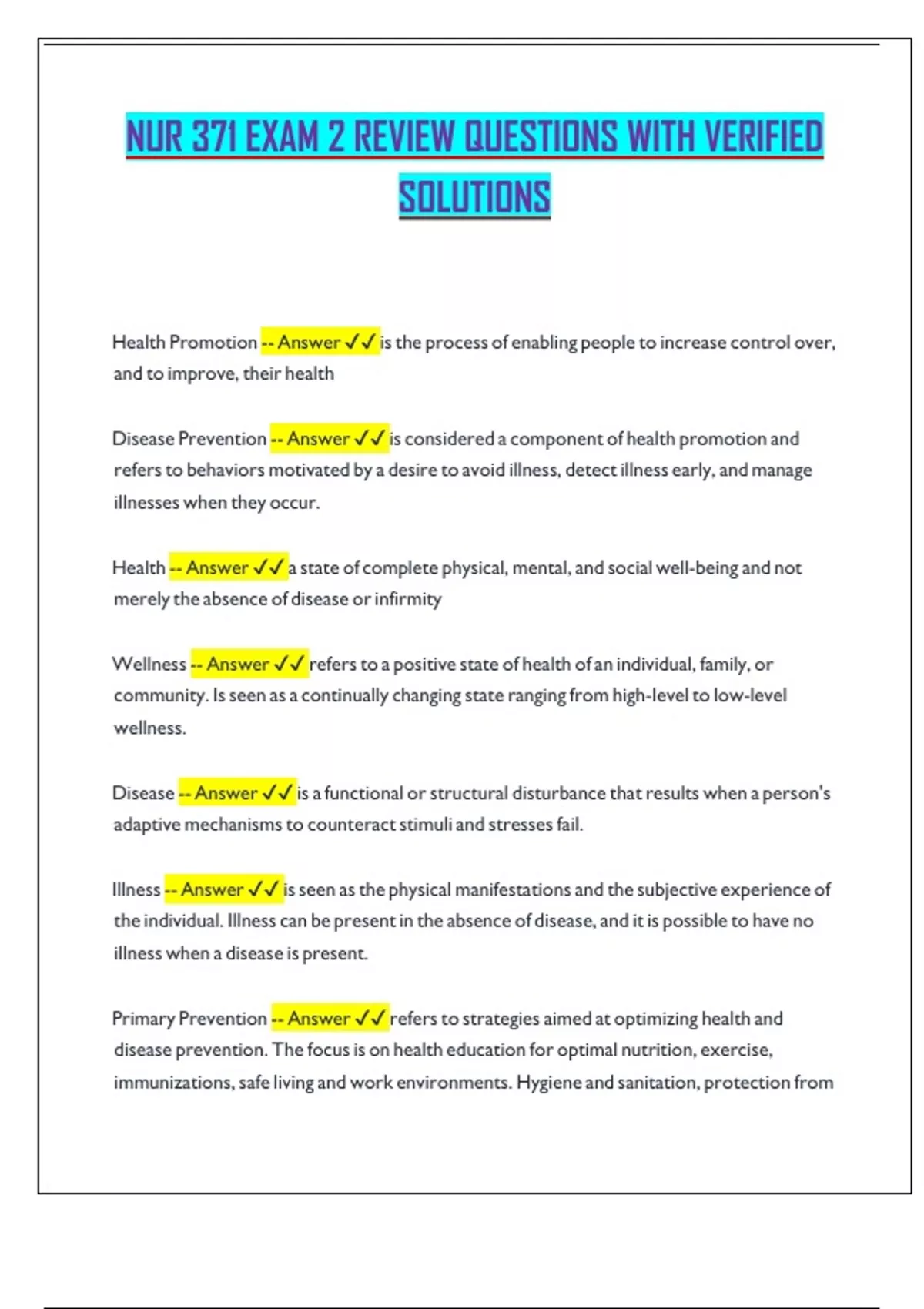 Health -- Answer ✔✔ a state of complete physical, mental, and social well-being and not