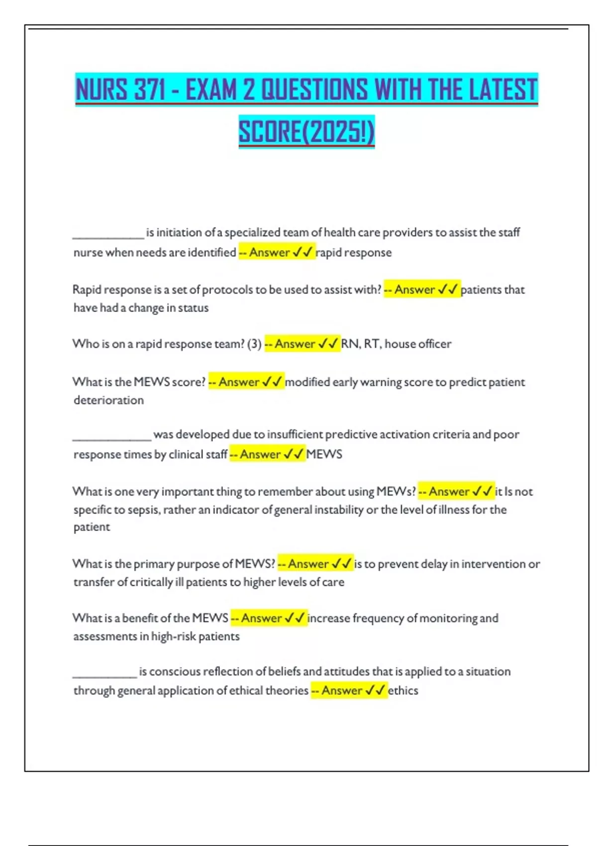 NURS 371 - EXAM 2 QUESTIONS WITH THE LATEST SCORE(2025!)