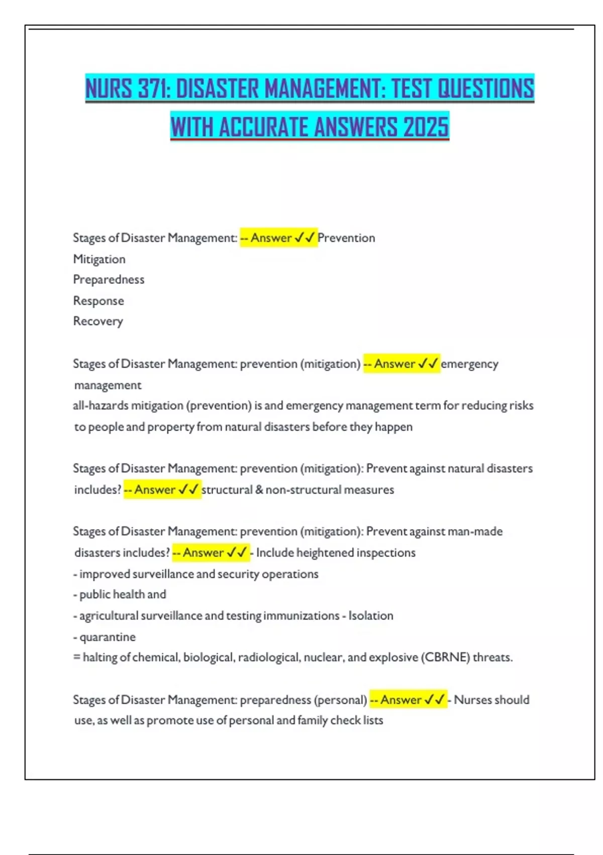 NURS 371: DISASTER MANAGEMENT: TEST QUESTIONS