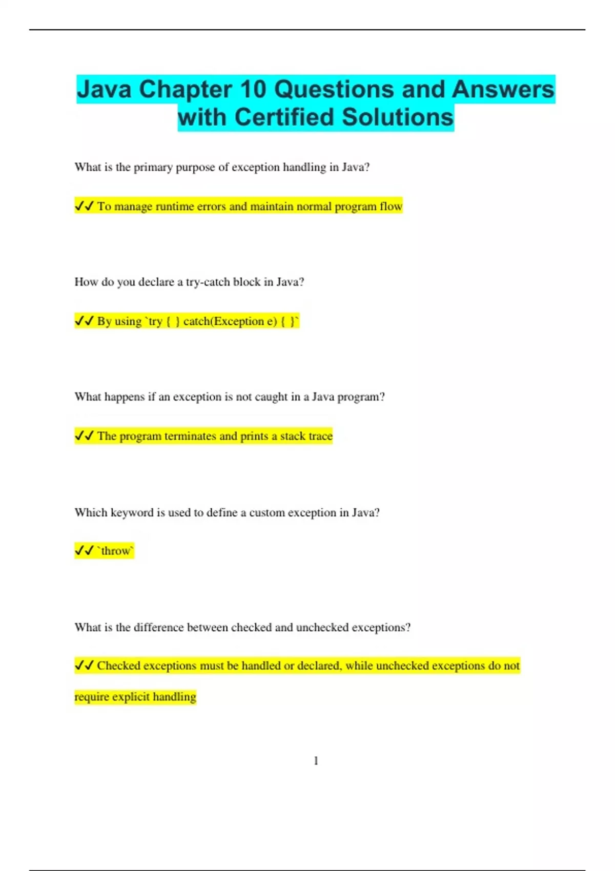 Java Chapter 10 Questions and Answers with Certified Solutions What is the primary purpose of exception handling in Java? To manage runtime errors and maintain normal program flow How do you declare a try-catch block in Java? By using `try { } catch(Exception e) { }` What happens if an exception is not caught in a Java program? The program terminates and prints a stack trace Which keyword is used to define a custom exception in Java? `throw` What is the difference between checked and unchecked exceptions? Checked exceptions must be handled or declared, while unchecked exceptions do not require explicit handling 2 Which Java class is the parent of all exceptions? `Throwable` How can you ensure that a block of code always executes, regardless of whether an exception occurs? By using a `finally` block What is the purpose of the `throws` keyword in a method signature? It declares exceptions that a method might throw How do you create a user-defined exception in Java? By extending the `Exception` class What is an `ArithmeticException` in Java? An exception that occurs when an illegal arithmetic operation, like division by zero, is performed What does the `getMessage()` method do in an exception object? 3 It returns a detailed error message about the exception Can multiple catch blocks be used for a single try block? Yes, multiple catch blocks can handle different exception types What is the purpose of the `finally` block? It ensures that a specific block of code executes regardless of whether an exception occurs What happens if an exception is thrown in the `finally` block? It overrides any previous exceptions thrown in the `try` block Can a `finally` block be used without a `catch` block?