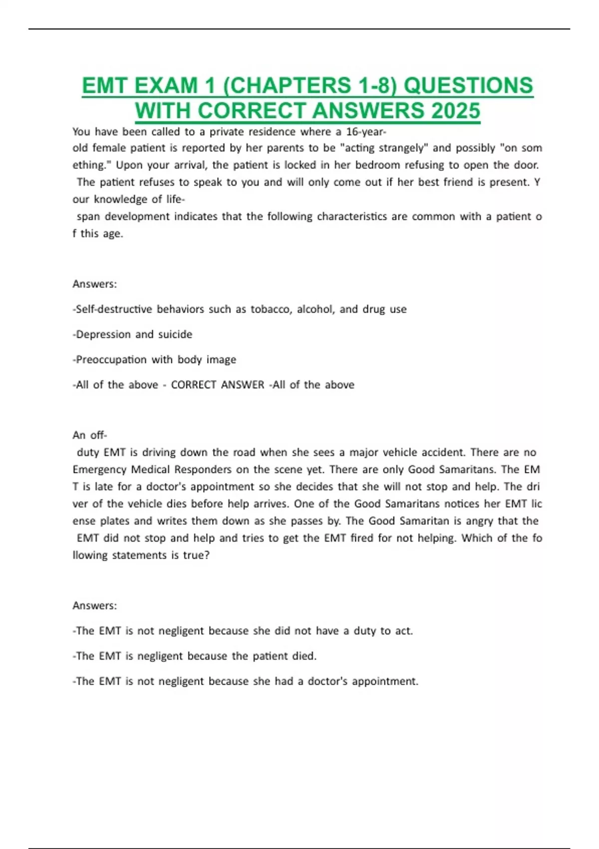 EMT EXAM 1 (CHAPTERS 1-8) QUESTIONS WITH CORRECT ANSWERS 2025