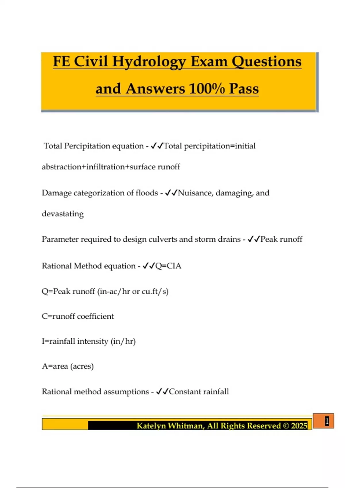 FE Civil Hydrology Exam Questions and Answers 100% Pass Total Percipitation equation - Total percipitation=initial abstraction+infiltration+surface runoff Damage categorization of floods - Nuisance, damaging, and devastating Parameter required to design culverts and storm drains - Peak runoff Rational Method equation - Q=CIA Q=Peak runoff (in-ac/hr or C=runoff coefficient I=rainfall intensity (in/hr) A=area (acres) Rational method assumptions - Constant rainfall 2 Katelyn Whitman, All Rights Reserved © 2025 Recurrence interval for peak flow is same as for design storm Runoff coeff is constant Usage of method only valid for small areas NRCS rainfall runoff method equation - Q=(P-0.2S)^2/(P+0.8S) Q=total runoff (in) P=gross rain (in) S=storage capacity (in) NRCS rainfall runoff method assumptions - Exponential decay of infiltration Losses from interception, storm period evap, depression storage, infiltration assumed 20% of storage area Conservation equation - Q=Av Q=flow A=area v=velocity 3 Katelyn Whitman, All Rights Reserved © 2025 Bernoulli's Equation parameters - Pressure energy + kinetic energy + potential energy *Does not take into account friction losses Energy conservation equation - Same as Bernoulli's Equation but friction flows are considered in equation Hydraulic radius equation - Cross sectional area / wetted perimeter Manning's Equation - Equation used to estimate velocity of flow in open channel v=(K/n)Rh^(2/3)S^(1/2) Hazen-Williams Equation - Equation