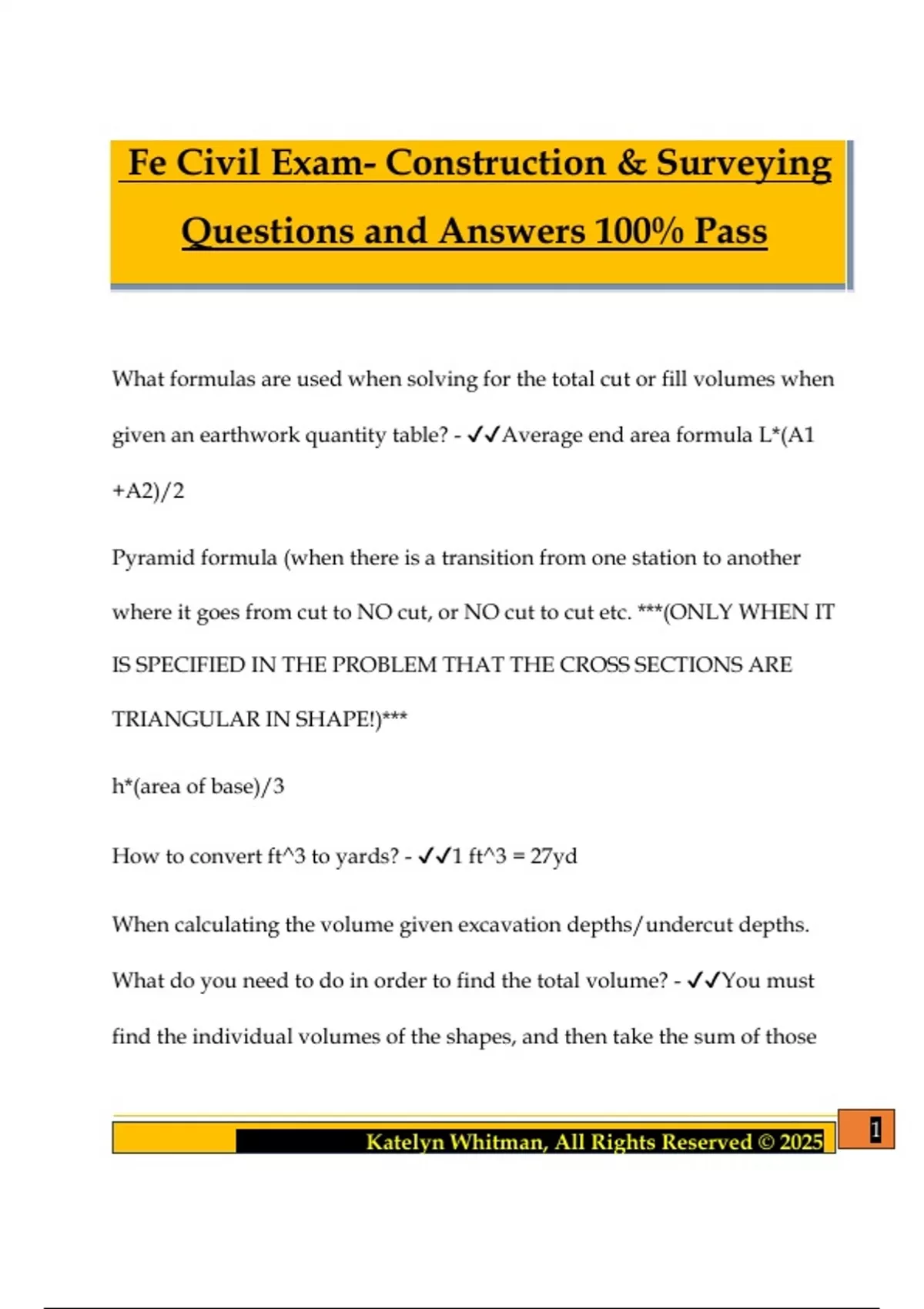 Fe Civil Exam- Construction & Surveying Questions and Answers 100% Pass What formulas are used when solving for the total cut or fill volumes when given an earthwork quantity table? - Average end area formula L*(A1 +A2)/2 Pyramid formula (when there is a transition from one station to another where it goes from cut to NO cut, or NO cut to cut etc. ***(ONLY WHEN IT IS SPECIFIED IN THE PROBLEM THAT THE CROSS SECTIONS ARE TRIANGULAR IN SHAPE!)*** h*(area of base)/3 How to convert ft^3 to yards? - 1 ft^3 = 27yd When calculating the volume given excavation depths/undercut depths. What do you need to do in order to find the total volume? - You must find the individual volumes of the shapes, and then take the sum of those 2 Katelyn Whitman, All Rights Reserved © 2025 volumes to find the total. The volume is found by multiplying the area by the depth. What is a borrow pit? - A borrow pit is a term used in construction for a hole, pit or excavation that has been dug for the purposes of removing gravel, clay and sand used in a construction project such as when building an overpass or embankment. What is waste versus borrow in cut/fill calulations? - Waste in when you have MORE cut than fill. Borrow is when you have LESS cut than fill. What is the Superpave mix design method: - Aggregate selection. Asphalt binder selection. Sample preparation (including compaction). Performance Tests. Density and voids calculations. Optimum asphalt binder content selection. 3 Katelyn Whitman, All Rights Reserved © 2025 Moisture susceptibility evaluation. What is Ninitial in Superpavement design? - The number of gyrations used as a measure of mixture compactability during construction. Mixes that compact too quickly (air voids at Ninitial are too low) may be tender during construction and unstable when subjected to traffic. Often, this is a good indication of aggregate quality - HMA with excess natural sand will frequently fail the Ninitial requirement. A mixture designed for greater than or equal to 3 million ESALs with 4 percent air voids at Ndesign should have at least 11 percent air voids at Ni