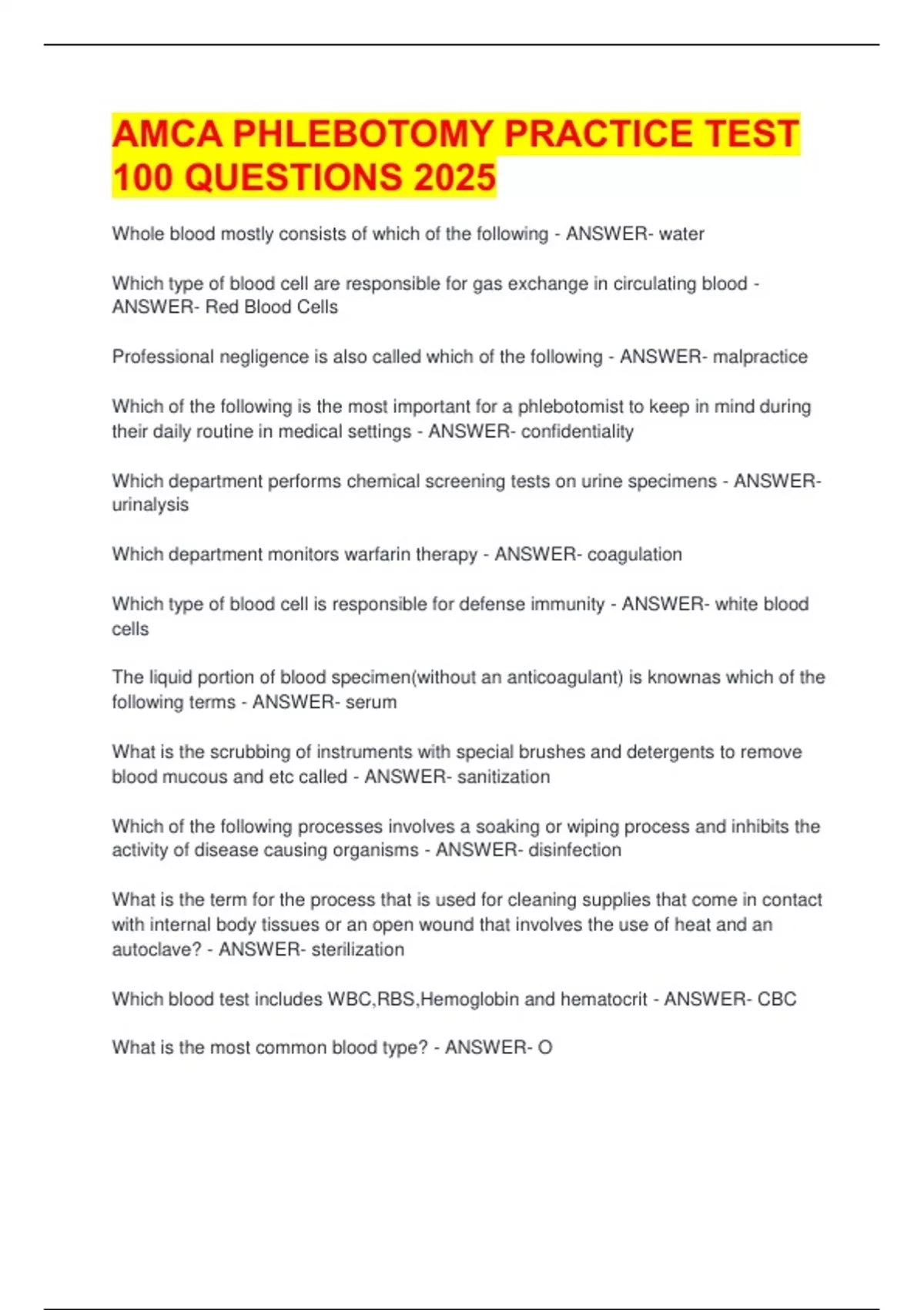 AMCA PHLEBOTOMY PRACTICE TEST 100 QUESTIONS 2025 Whole blood mostly consists of which of the following - ANSWER- water Which type of blood cell are responsible for gas exchange in circulating blood - ANSWER- Red Blood Cells Professional negligence is also called which of the following - ANSWER- malpractice Which of the following is the most important for a phlebotomist to keep in mind during their daily routine in medical settings - ANSWER- confidentiality Which department performs chemical screening tests on urine specimens - ANSWER- urinalysis Which department monitors warfarin therapy - ANSWER- coagulation Which type of blood cell is responsible for defense immunity - ANSWER- white blood cells The liquid portion of blood specimen(without an anticoagulant) is knownas which of the following terms - ANSWER- serum What is the scrubbing of instruments with special brushes and detergents to remove blood mucous and etc called - ANSWER- sanitization Which of the following processes involves a soaking or wiping process and inhibits the activity of disease causing organisms - ANSWER- disinfection