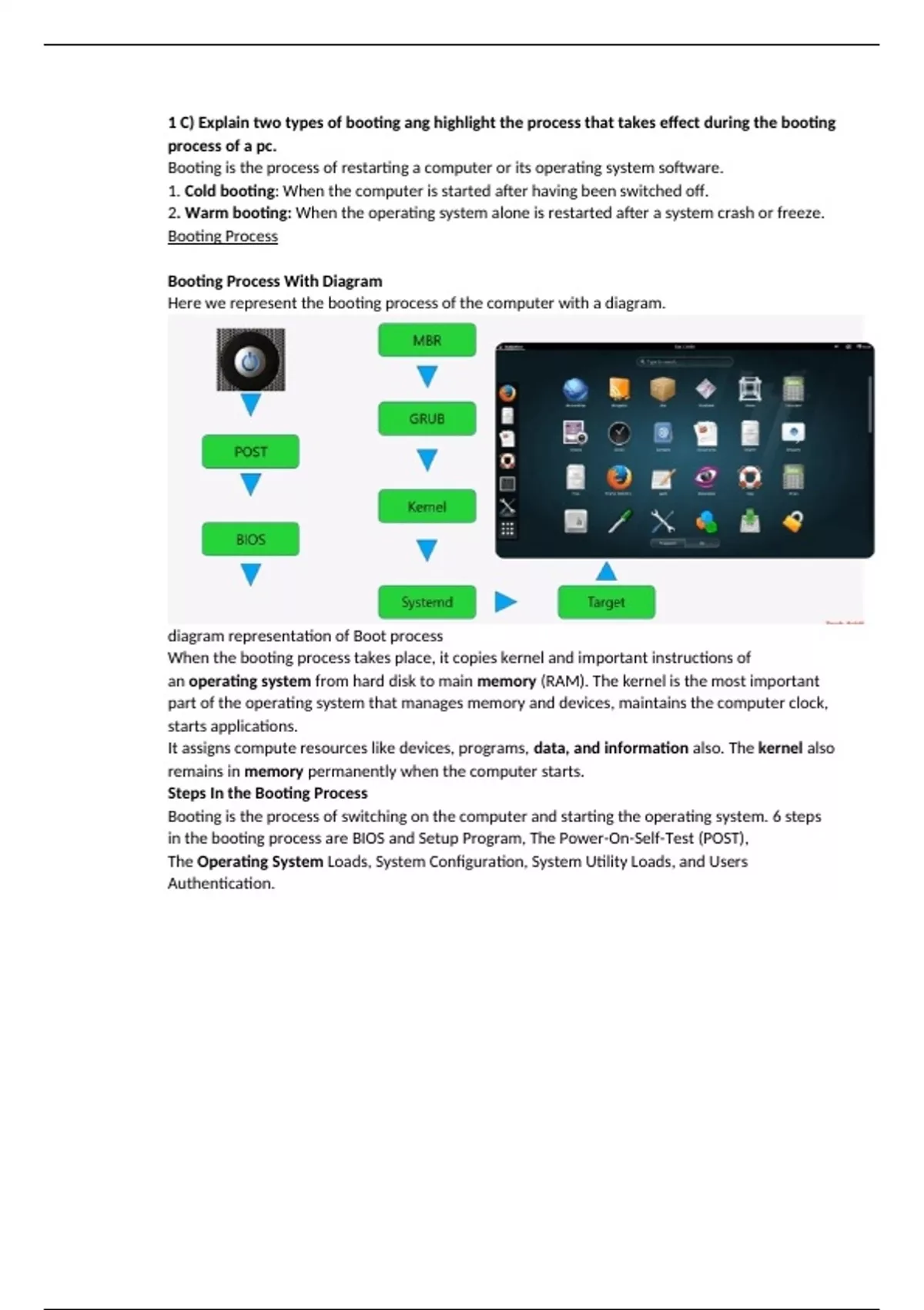 Booting is the process of switching on the computer and starting the operating system. 6 steps