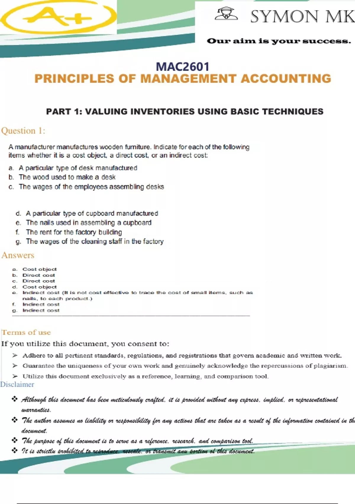 Summary Principles of Management Accounting - PART 1: VALUING INVENTORIES USING BASIC TECHNIQUES