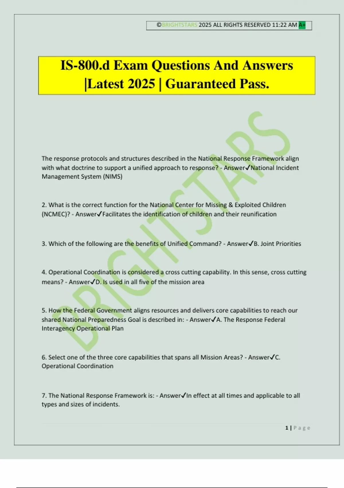 7. The National Response Framework is: - Answer✔In effect at all times and applicable to all