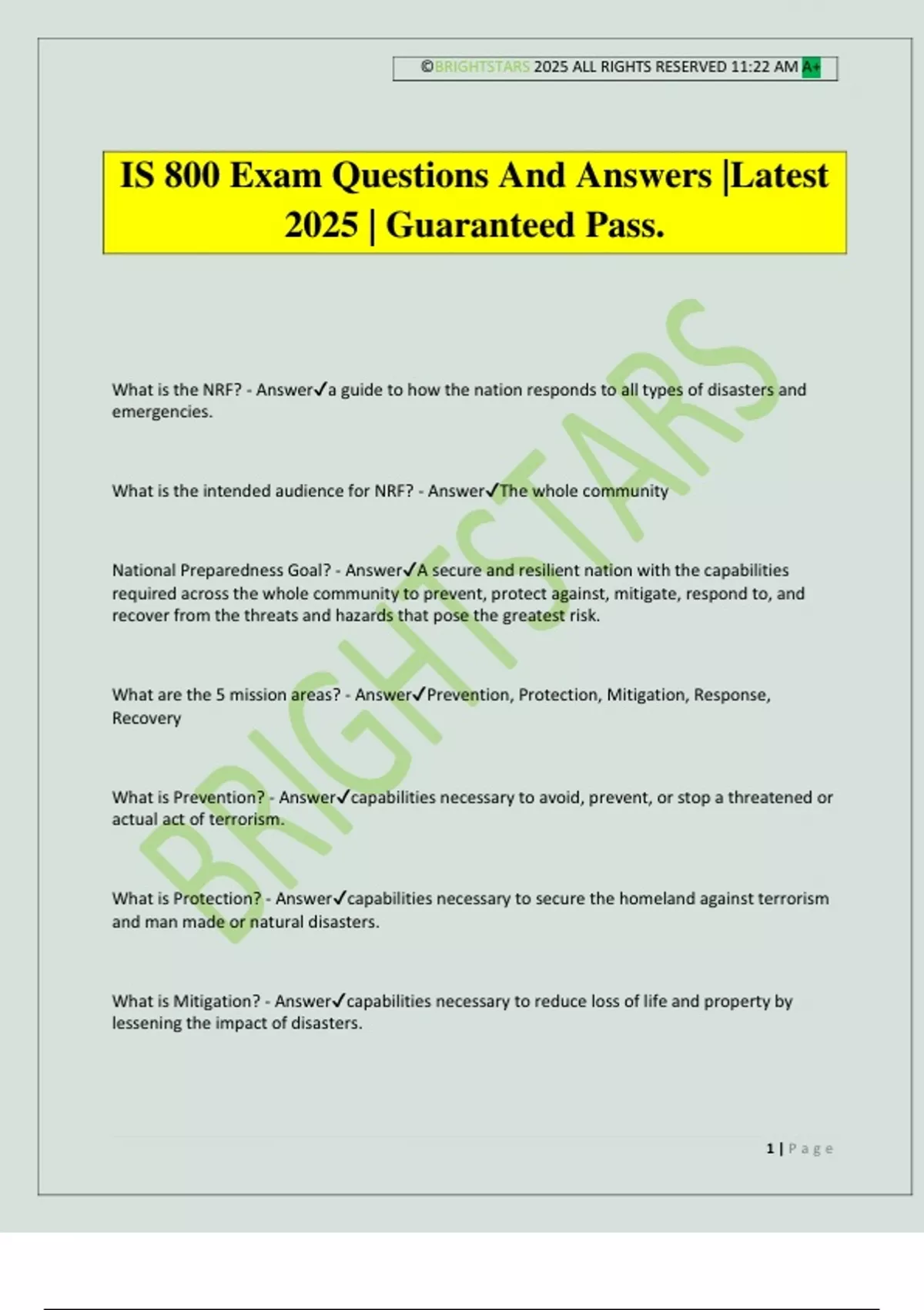 National Preparedness Goal? - Answer✔A secure and resilient nation with the capabilities
