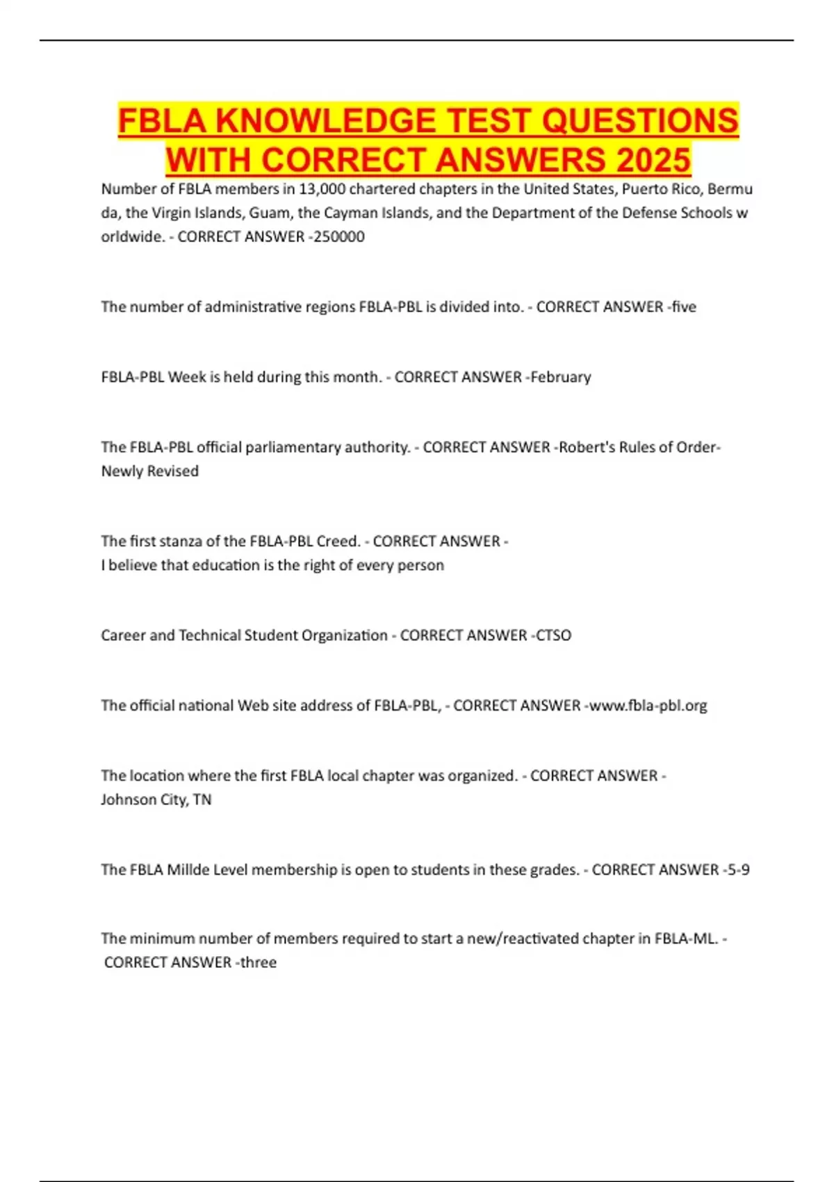 FBLA KNOWLEDGE TEST QUESTIONS WITH CORRECT ANSWERS 2025