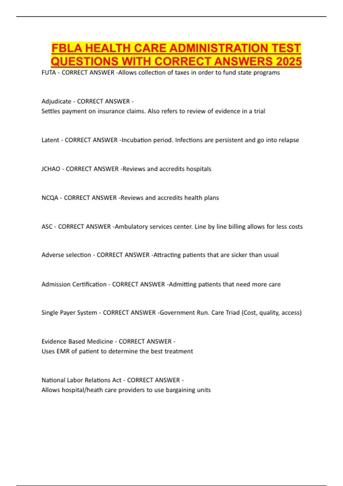 FBLA HEALTH CARE ADMINISTRATION TEST