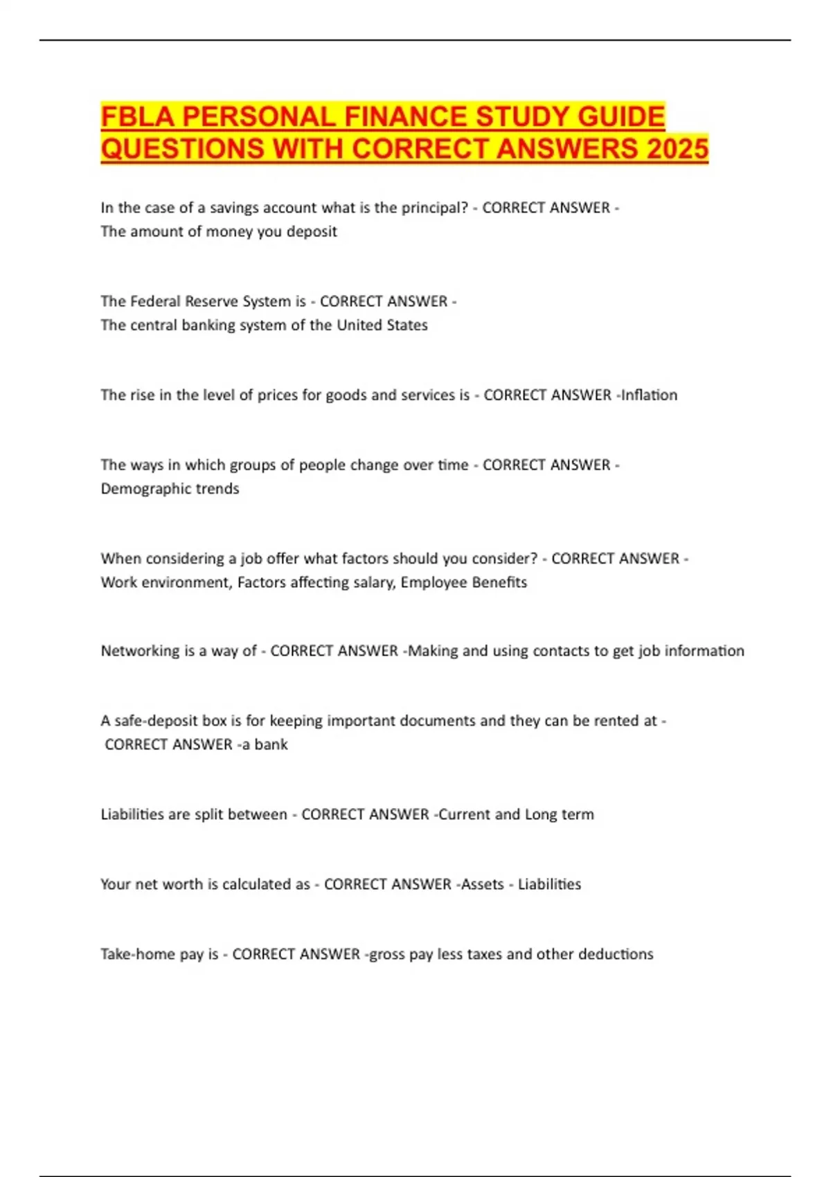 FBLA PERSONAL FINANCE STUDY GUIDE QUESTIONS WITH CORRECT ANSWERS 2025