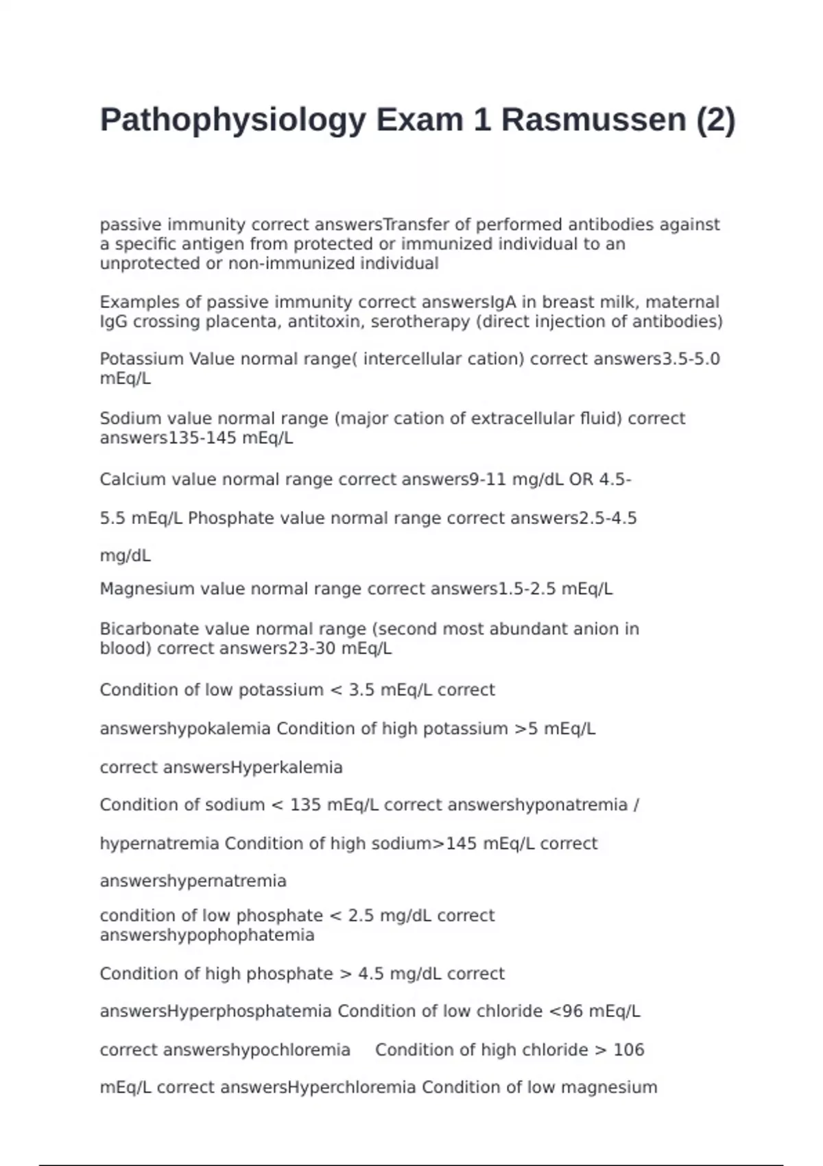 passive immunity correct answersTransfer of performed antibodies against a specific antigen from protected or immunized individual to an unprotected or non-immunized individual Examples of passive immunity correct answersIgA in breast milk, maternal IgG crossing placenta, antitoxin, serotherapy (direct injection of antibodies) Potassium Value normal range( intercellular cation) correct answers3.5-5.0 mEq/L Sodium value normal range (major cation of extracellular fluid) correct answers135-145 mEq/L Calcium value normal range correct answers9-11 mg/dL OR 4.5-5.5 mEq/L Phosphate value normal range correct answers2.5-4.5 mg/dL Magnesium value normal range correct answers1.5-2.5 mEq/L Bicarbonate value normal range (second most abundant anion in blood) correct answers23-30 mEq/L Condition of low potassium < 3.5 mEq/L correct answershypokalemia Condition of high potassium >5 mEq/L correct answersHyperkalemia Condition of sodium < 135 mEq/L correct answershyponatremia / hypernatremia Condition of high sodium>145 mEq/L correct answershypernatremia condition of low phosphate < 2.5 mg/dL correct answershypophophatemia Condition of high phosphate > 4.5 mg/dL correct answersHyperphosphatemia Condition of low chloride <96 mEq/L correct answershypochloremia Condition of high chloride > 106 mEq/L correct answersHyperchloremia Condition of low magnesium <1.5 mEq/L correct answershypomagnesemia Condition of high magnesium >2.5 mEq/L correct answersHypermagesemia