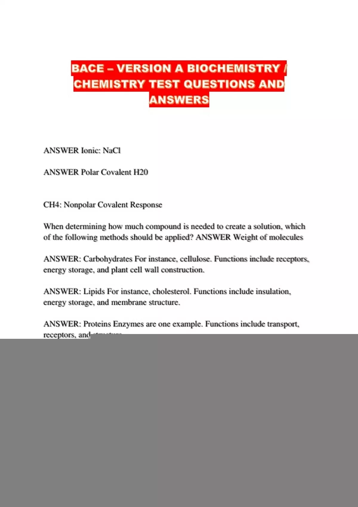 BACE – VERSION A BIOCHEMISTRY / CHEMISTRY TEST QUESTIONS AND ANSWERS...