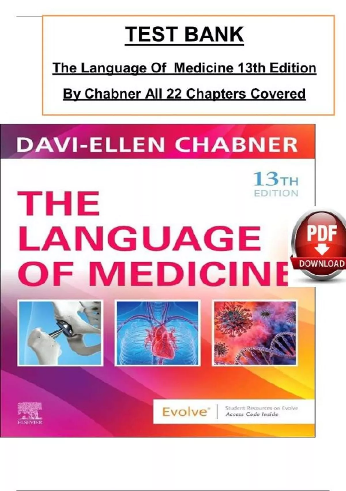Test Bank for The Language Of Medicine 13th Edition by Chabner, 9780443107795 (All Chapter 1-22). Full Chapters Include;...1. Basic Word Structure 2. Terms Pertaining to the Body as a Whole 3. Suffixes 4. Prefixes 5. Digestive System 6. Additional Suffixes and Digestive System Terminology 7. Urinary System 8. Female Reproductive System 9. Male Reproductive System 10. Nervous System 11. Cardiovascular System 12. Respiratory System 13. Blood System 14. Lymphatic and Immune Systems 15. Musculoskeletal System 16. Skin 17. Sense Organs: The Eye and the Ear 18. Endocrine System 19. Cancer Medicine (Oncology) 20. Radiology and Nuclear Medicine 21. Pharmacology 22. Psychiatry