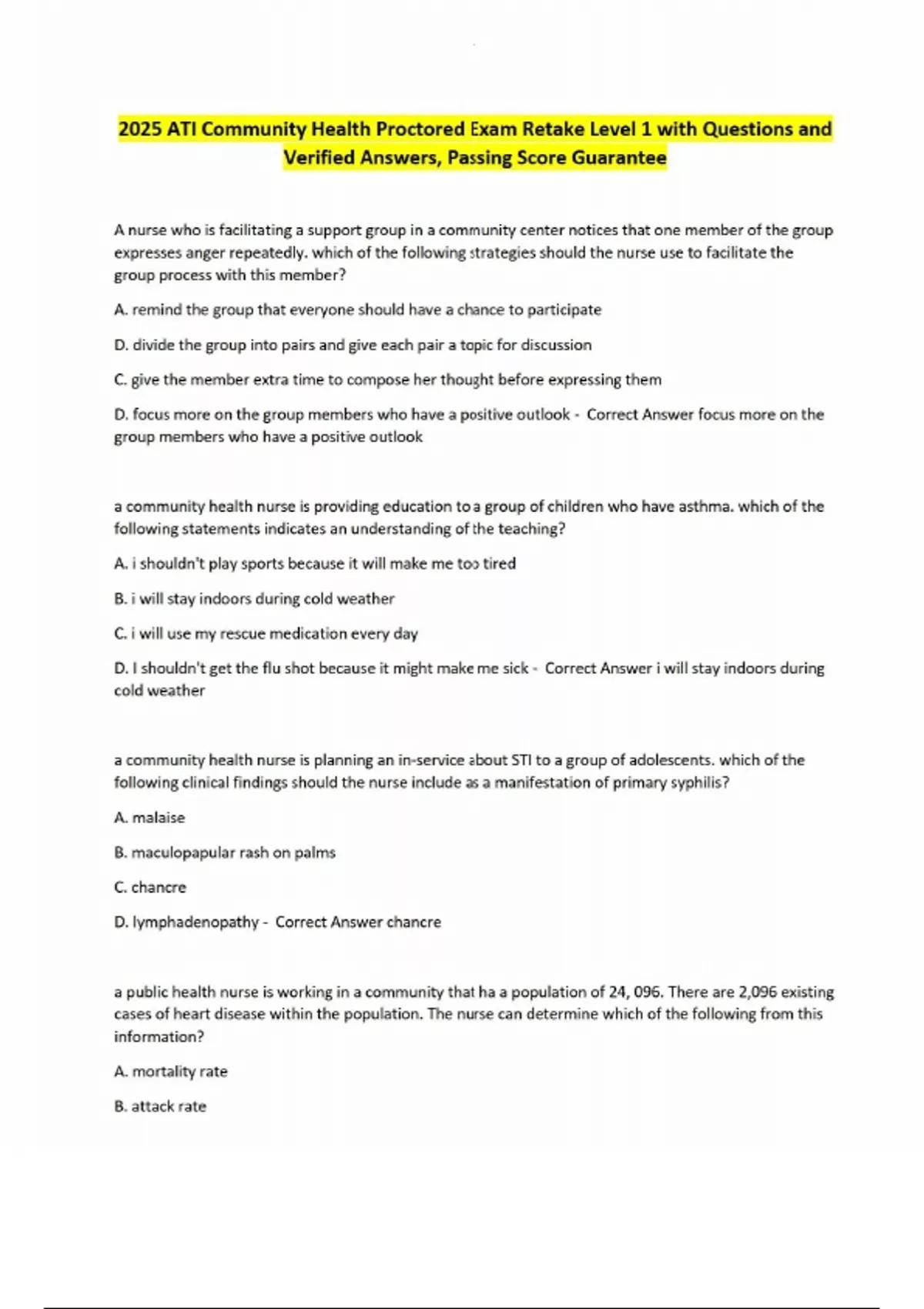 2025 ATI Community Health Proctored Exam Retake Level 1 with Questions and Verified Answers, Passing Score Guarantee A nurse who is facilitating a support group in a community center notices that one member of the group expresses anger repeatedly. which of the following strategies should the nurse use to facilitate the group process with this member? A. remind the group that everyone should have a chance to participate D. divide the group into pairs and give each pair a topic for discussion C. give the member extra time to compose her thought before expressing them D. focus more on the group members who have a positive outlook - Correct Answer focus more on the group members who have a positive outlook a community health nurse is providing education to a group of children who have asthma. which of the following statements indicates an understanding of the teaching? A. i shouldn't play sports because it will make me too tired B. i will stay indoors during cold weather C. i will use my rescue medication every day D. I shouldn't get the flu shot because it might make me sick - Correct Answer i will stay indoors during cold weather a community health nurse is planning an in-service about STI to a group of adolescents. which of the following clinical findings should the nurse include as a manifestation of primary syphilis? A. malaise B. maculopapular rash on palms C. chancre D. lymphadenopathy - Correct Answer chancre a public health nurse is working in a community that ha a population of 24, 096. There are 2,096 existing cases of heart disease within the population. The nurse can determine which of the following from this information?