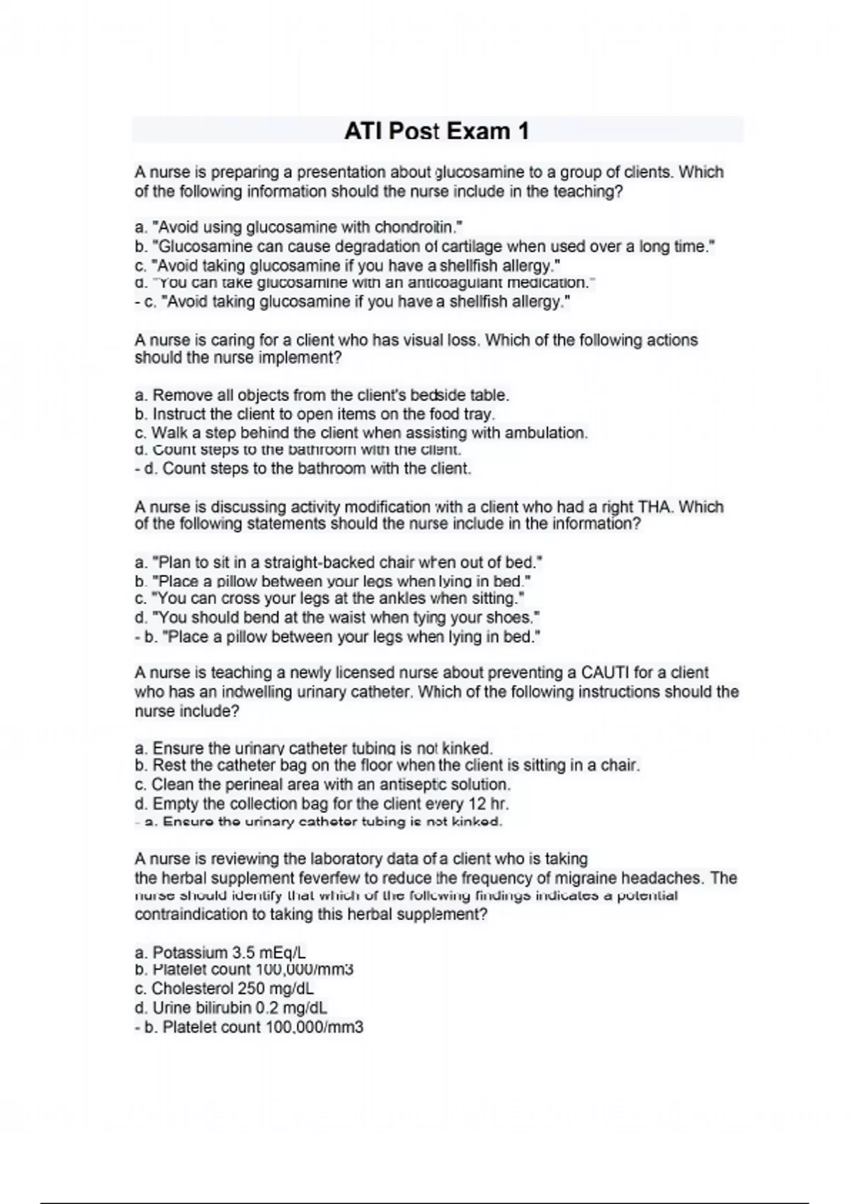 A nurse is preparing a presentation about glucosamine to a group of clients. Which of the following information should the nurse include in the teaching? a. "Avoid using glucosamine with chondroitin." b. "Glucosamine can cause degradation of cartilage when used over a long time." c. "Avoid taking glucosamine if you have a shellfish allergy." d. "You can take glucosamine with an anticoagulant medication." - c. "Avoid taking glucosamine if you have a shellfish allergy." A nurse is caring for a client who has visual loss. Which of the following actions should the nurse implement? a. Remove all objects from the client's bedside table. b. Instruct the client to open items on the food tray. c. Walk a step behind the client when assisting with ambulation. d. Count steps to the bathroom with the client. - d. Count steps to the bathroom with the client. A nurse is discussing activity modification with a client who had a right THA. Which of the following statements should the nurse include in the information? a. "Plan to sit in a straight-backed chair when out of bed." b. "Place a pillow between your legs when lying in bed." c. "You can cross your legs at the ankles when sitting." d. "You should bend at the waist when tying your shoes." - b. "Place a pillow between your legs when lying in bed." A nurse is teaching a newly licensed nurse about preventing a CAUTI for a client who has an indwelling urinary catheter. Which of the following instructions should the nurse include? a. Ensure the urinary catheter tubing is not kinked. b. Rest the catheter bag on the floor when the client is sitting in a chair. c. Clean the perineal area with an antiseptic solution. d. Empty the collection bag for the client every 12 hr. - a. Ensure the urinary catheter tubing is not kinked. A nurse is reviewing the laboratory data of a client who is taking the herbal supplement feverfew to reduce the frequency of migraine headaches. The nurse should identify that which of the following findings indicates a potential contraindication to taking this herbal supplement? a. Potassium 3.5 mEq/L b. Platelet count 100,000/mm3 c. Cholesterol 250 mg/dL d. Urine bilirubin 0.2 mg/dL - b. Platelet count 100,000/mm3 A nurse is providing dietary teaching to a client who has heart failure. The nurse should identify which of the following client statements indicates an understanding of the teaching? a. "I will use homemade vinegar and oil dressings on my salads." b. "I should purchase low-calorie frozen meals for my lunches." c. "I should add salt when cooking my food so I do not add it at the table." d. "I will increase my dietary intake of processed cheese products." - a. "I will use homemade vinegar and oil dressings on my salads." A nurse is caring for a client who is postoperative and has a history of heart failure. The client reports slight dyspnea when ambulating. Which of the following findings should the nurse expect when performing a skin assessment? a. Petechiae over the client's chest and abdomen b. Tenting of the skin on the client's arm c. Shiny areas on the client's ankles and feet d. Dry, flaky skin on the client's arms and hands - c. Shiny areas on the client's ankles and feet A hospice nurse is planning end-of-life comfort care for a client. Which of the following interventions should the nurse include in the plan? a. Cover the client with an electric blanket if extremities become mottled. b. Provide frequent feedings during the day. c. Position the client on their side to improve breathing. d. Remove visitors from the room if the client becomes restless. - c. Position the client on their side to improve breathing. A nurse is assessing a client who has a sodium level of 124 mEq/L. Which of the following findings should the nurse expect? a. Reports thirst b. Decreased consciousness c. Reports constipation d. Swollen tongue - b. Decreased consciousness A nurse is teaching a client who has a prescription for continuous ambulatory peritoneal dialysis. Which of the following instructions should the nurse include? a. Eat a low-fiber diet to maintain dialysate flow. b. Warm the dialysate in the microwave before instillation. c. Expect the dialysate outflow to appear cloudy. d. Allow the dialysate to dwell for 4 hr during each exchange. - d. Allow the dialysate to dwell for 4 hr during each exchange. A nurse is caring for a client who has an endotracheal tube. Which of the following actions should the nurse take? a. Perform endotracheal suctioning on the client every hour. b. Use clean technique to suction the client's endotracheal tube. c. Increase the oxygen flow before suctioning the client's endotracheal tube. d. Instill 0.9% sodium chloride into the client's endotracheal tube before suctioning. - c. Increase the oxygen flow before suctioning the client's endotracheal tube.