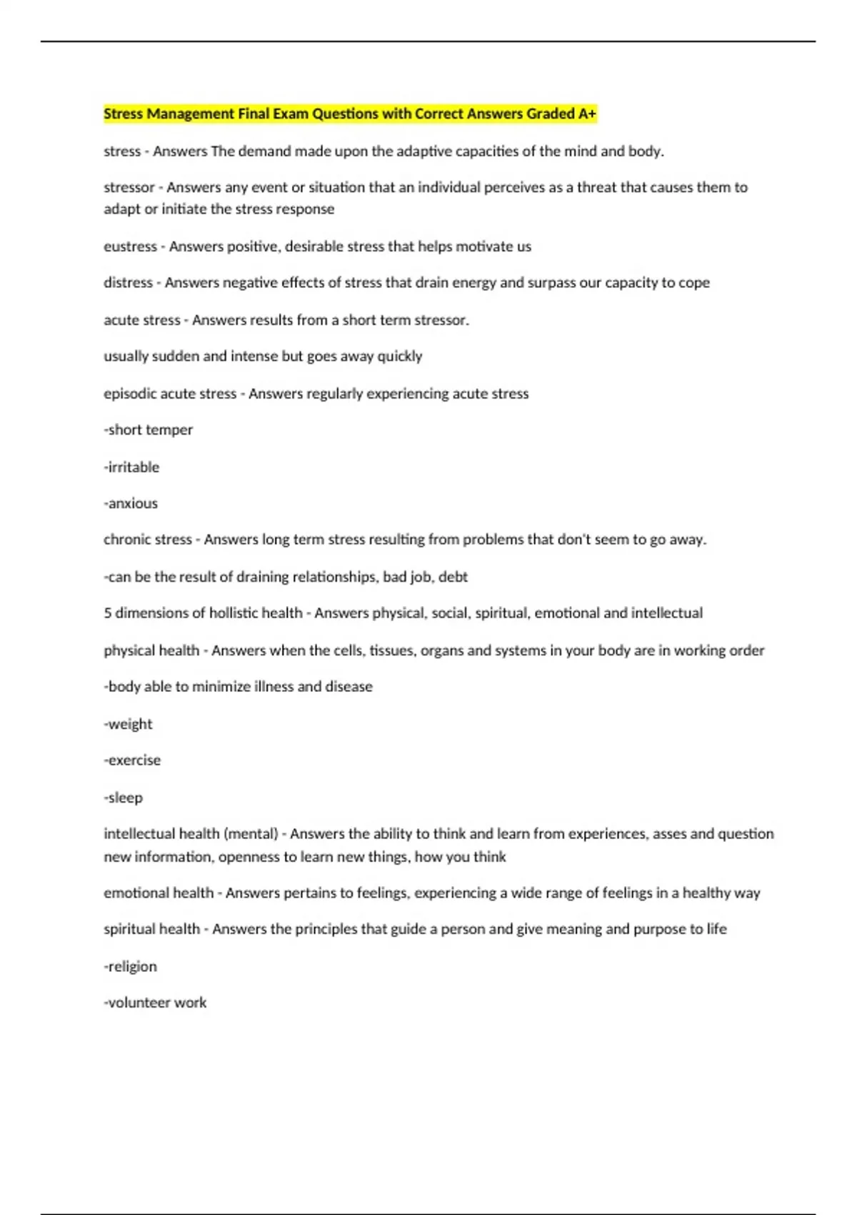 Stress Management Final Exam Questions with Correct Answers Graded A+