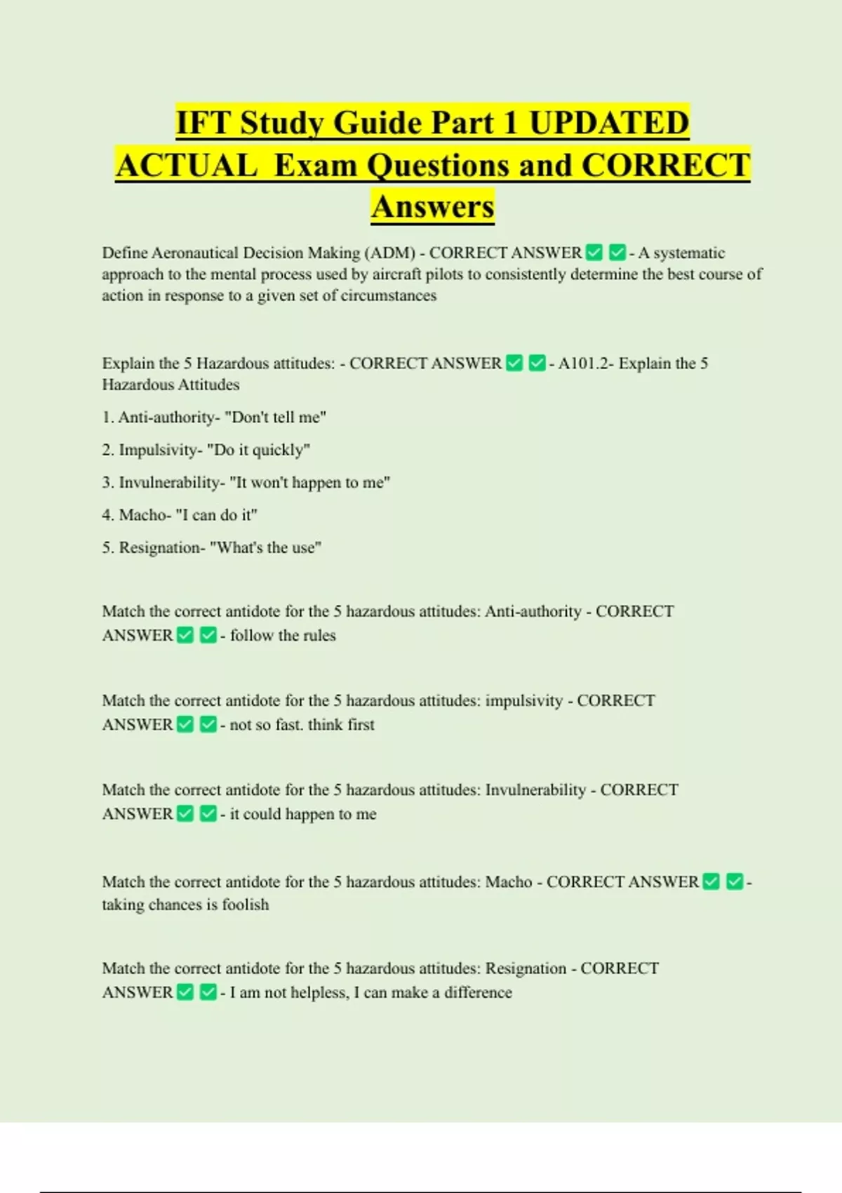 IFT Study Guide Part 1 UPDATED ACTUAL Exam Questions and CORRECT Answers Define Aeronautical Decision Making (ADM) - CORRECT ANSWER - A systematic approach to the mental process used by aircraft pilots to consistently determine the best course of action in response to a given set of circumstances Explain the 5 Hazardous attitudes: - CORRECT ANSWER Hazardous Attitudes 1. Anti-authority- "Don't tell me" 2. Impulsivity- "Do it quickly" 3. Invulnerability- "It won't happen to me" 4. Macho- "I can do it" 5. Resignation- "What's the use" - A101.2- Explain the 5