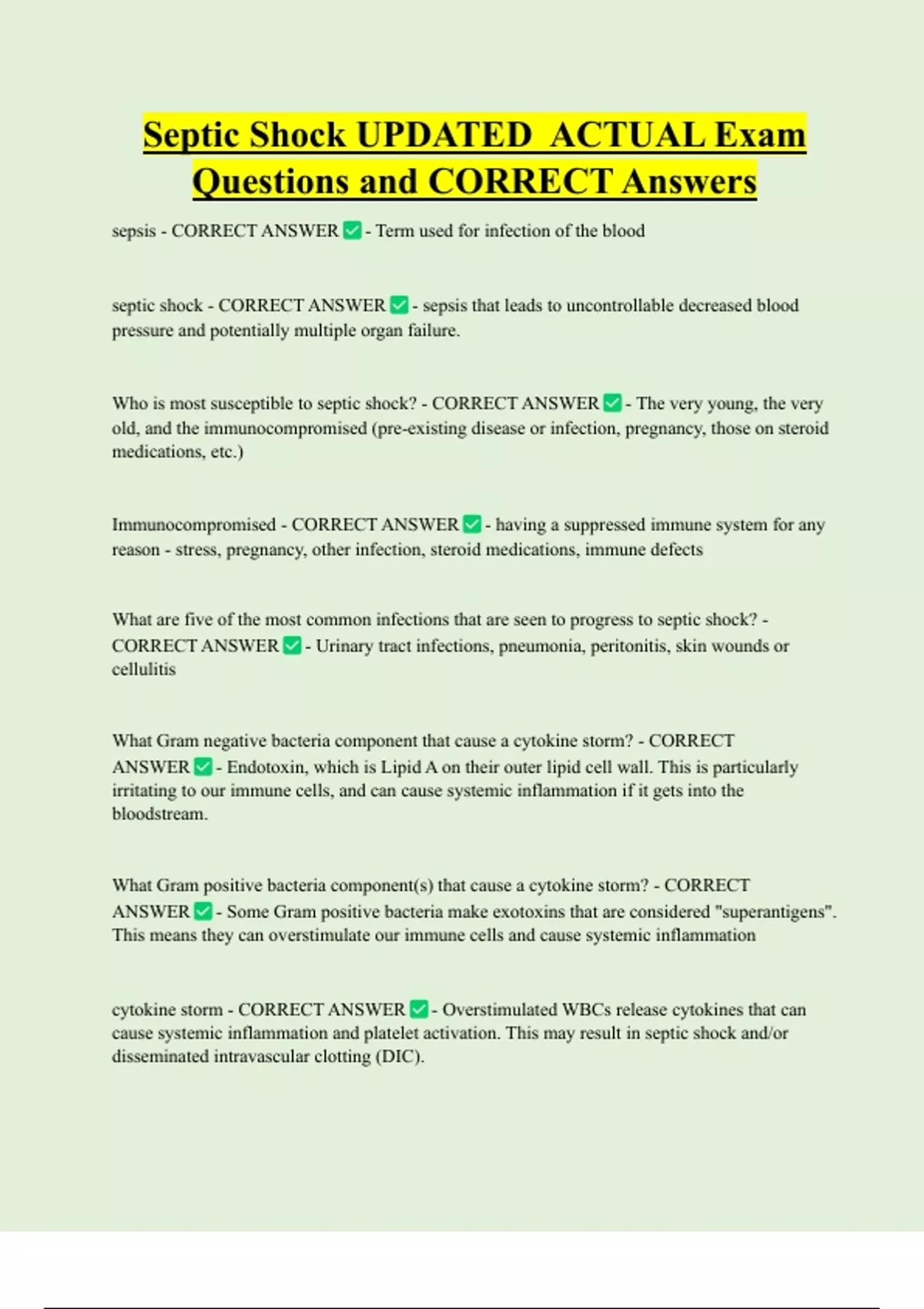 Septic Shock UPDATED ACTUAL Exam Questions and CORRECT Answers