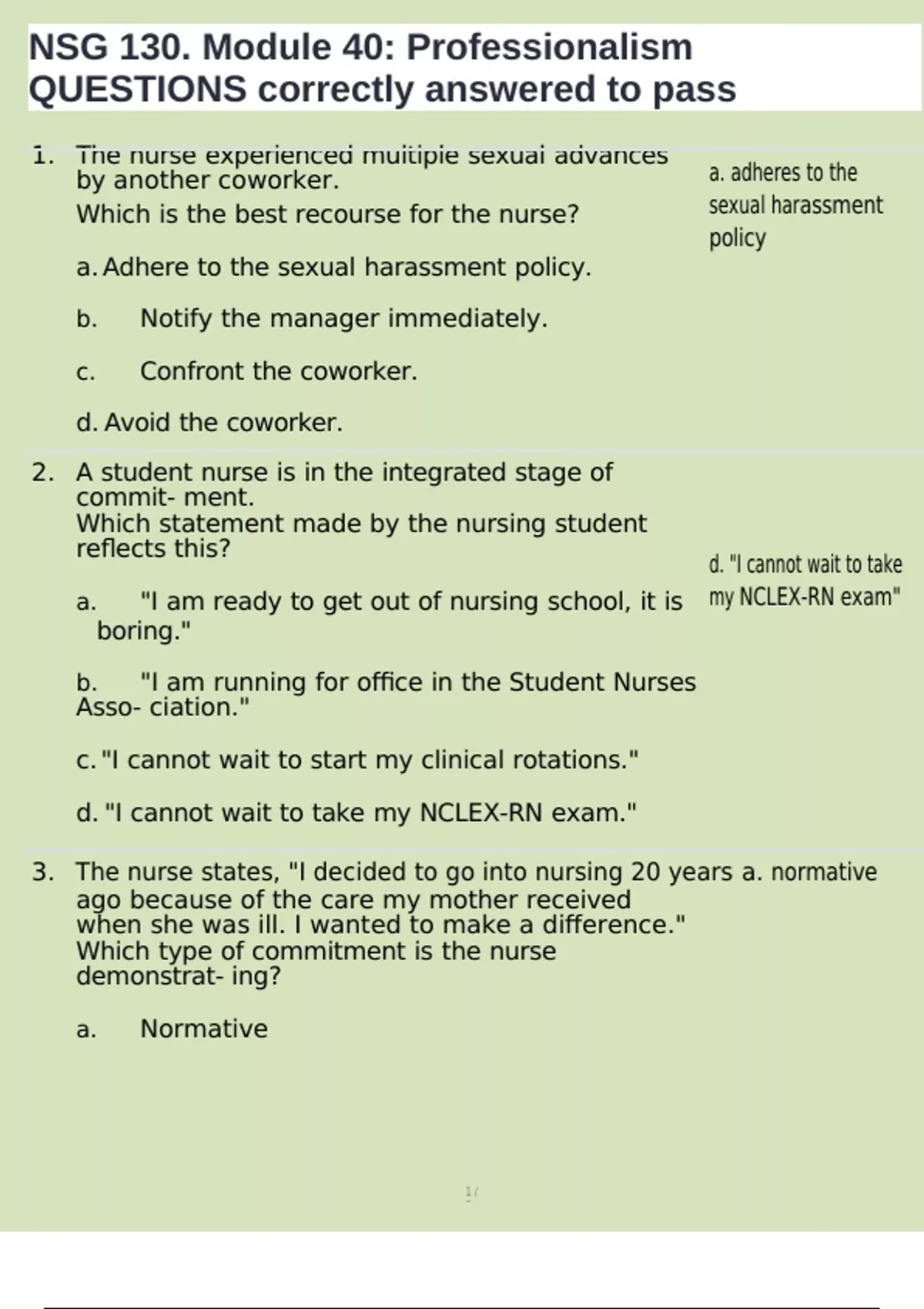 NSG 130. Module 40: Professionalism QUESTIONS correctly answered to pass