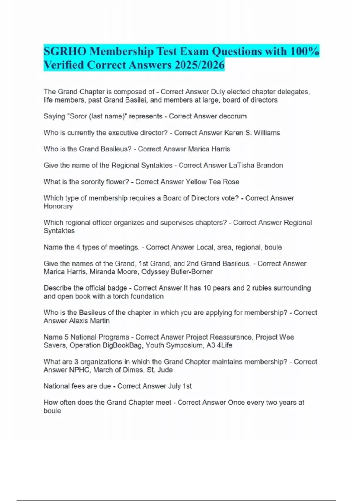 SGRHO Membership Test Exam Questions with 100% Verified Correct Answers 2025/2026 The Grand Chapter is composed of - Correct Answer Duly elected chapter delegates, life members, past Grand Basilei, and members at large, board of directors Saying "Soror (last name)" represents - Correct Answer decorum Who is currently the executive director? - Correct Answer Karen S. Williams Who is the Grand Basileus? - Correct Answer Marica Harris Give the name of the Regional Syntaktes - Correct Answer LaTisha Brandon What is the sorority flower? - Correct Answer Yellow Tea Rose Which type of membership requires a Board of Directors vote? - Correct Answer Honorary Which regional officer organizes and supervises chapters? - Correct Answer Regional Syntaktes Name the 4 types of meetings. - Correct Answer Local, area, regional, boule Give the names of the Grand, 1st Grand, and 2nd Grand Basileus. - Correct Answer Marica Harris, Miranda Moore, Odyssey Butler-Borner Describe the official badge - Correct Answer It has 10 pears and 2 rubies surrounding and open book with a torch foundation Who is the Basileus of the chapter in which you are applying for membership? - Correct Answer Alexis Martin Name 5 National Programs - Correct Answer Project Reassurance, Project Wee Savers, Operation BigBookBag, Youth Symposium, A3 4Life What are 3 organizations in which the Grand Chapter maintains membership? - Correct Answer NPHC, March of Dimes, St. Jude National fees are due - Correct Answer July 1st How often does the Grand Chapter meet - Correct Answer Once every two years at boule