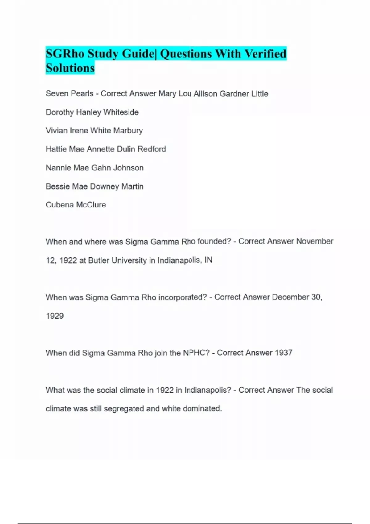 SGRho Study Guide| Questions With Verified Solutions Seven Pearls - Correct Answer Mary Lou Allison Gardner Little Dorothy Hanley Whiteside Vivian Irene White Marbury Hattie Mae Annette Dulin Redford Nannie Mae Gahn Johnson Bessie Mae Downey Martin Cubena McClure When and where was Sigma Gamma Rho founded? - Correct Answer November 12, 1922 at Butler University in Indianapolis, IN When was Sigma Gamma Rho incorporated? - Correct Answer December 30, 1929 When did Sigma Gamma Rho join the NPHC? - Correct Answer 1937 What was the social climate in 1922 in Indianapolis? - Correct Answer The social climate was still segregated and white dominated. Which organization was based in close proximity to Butler University, and in which ways could their presence impact the surrounding community? - Correct Answer The Ku Klux Klan was in close proximity to the university . They boasted that they had the largest number of members outside of the