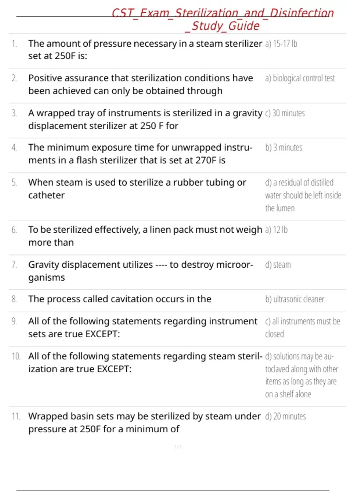 1. The amount of pressure necessary in a steam sterilizer a) 15-17 lb