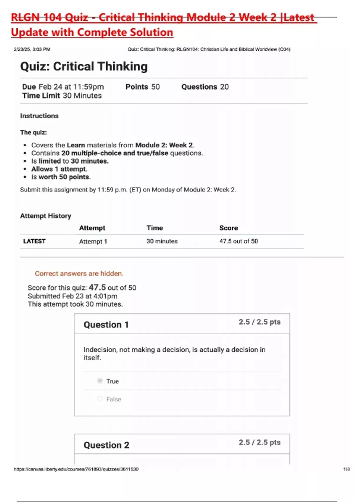 RLGN 104 Quiz - Critical Thinking Module 2 Week 2 |Latest Update with Complete Solution