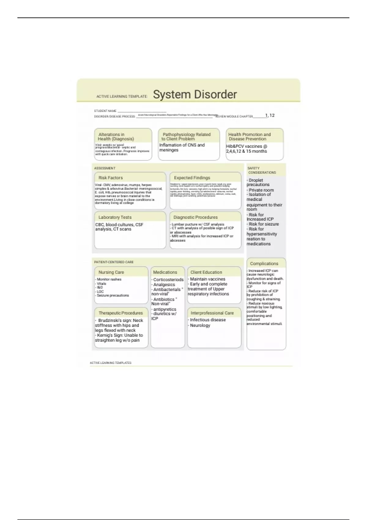 This is a comprehensive and detailed ATI template on; Acute Neurological Disorders Reportable Findings for a Client Who Has Meningitis. An Essential Study Resource just for YOU!!
