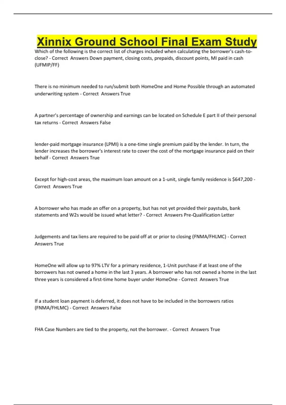 Xinnix Ground School Final Exam Study Which of the following is the correct list of charges included when calculating the borrower's cash-to-close? - Correct Answers Down payment, closing costs, prepaids, discount points, MI paid in cash (UFMIP/FF) There is no minimum needed to run/submit both HomeOne and Home Possible through an automated underwriting system - Correct Answers True A partner's percentage of ownership and earnings can be located on Schedule E part II of their personal tax returns - Correct Answers False lender-paid mortgage insurance (LPMI) is a one-time single premium paid by the lender. In turn, the lender increases the borrower's interest rate to cover the cost of the mortgage insurance paid on their behalf - Correct Answers True Except for high-cost areas, the maximum loan amount on a 1-unit, single family residence is $647,200 - Correct Answers True A borrower who has made an offer on a property, but has not yet provided their paystubs, bank statements and W2s would be issued what letter? - Correct Answers Pre-Qualification Letter Judgements and tax liens are required to be paid off at or prior to closing (FNMA/FHLMC) - Correct Answers True HomeOne will allow up to 97% LTV for a primary residence, 1-Unit purchase if at least one of the borrowers has not owned a home in the last 3 years. A borrower who has not owned a home in the last three years is considered a first-time home buyer under HomeOne - Correct Answers True If a student loan payment is deferred, it does not have to be included in the borrowers ratios (FNMA/FHLMC) - Correct Answers False FHA Case Numbers are tied to the property, not the borrower. - Correct Answers True YTD paystubs will be required from a borrower that is self-employed (Schedule C). - Correct Answers False A borrower that is self-employed (Schedule C) will typically not be required to provide a YTD paystub - Correct Answers True The builder must provide an appraisal certificate to the mortgage company on an FHA new construction loan prior to closing - Correct Answers False What is the maximum seller contribution allowed for a primary residence at 85% LTV (FNMA/FHLMC) - Correct Answers 6% When taking an application for a VA loan on new construction, it is very important to order the appraisal: - Correct Answers When the house is completed A tax-service fee is a non-allowable fee by FHA - Correct Answers True If gift funds will be utilized in the purchase, what documentation is required? - Correct Answers Gift letter stating the amount of the gift, that it doesn't need to be repaid, and the donor is a family member. Verification that the donor has the funds available to make the gift. and Verification that the borrower has deposited the funds into an account Residual income is the amount of income available for family support after taxes and social security expense have been subtracted from the gross income and after PITI and other long-term debt has been paid - Correct Answers True Joint tenants with right of survivorship (JTWROS) is an acceptable manner in which title may be held - Correct Answers True If a borrower qualifies for an agency loan of $215,000, FHLMC is a viable loan option - Correct Answers True Unless a borrower can document extenuating circumstances they must wait at least 7 years from a Chapter 7 bankruptcy - Correct Answers False FNMA and FHLMC define a large deposit as any single deposit that exceeds 50% of the borrower's total monthly qualifying - Correct Answers True A HUD consultant would not be required for an FHA 203(k) Standard program - Correct Answers False A borrower's income is a factor considered when determining the principal limit (maximum loan amount) for a reverse mortgage - Correct Answers False Based on a loan amount of $225,000, how many years will it take your customer to break-even if they choose to pay 1.5% in discount points to secure an interest rate of 6.00% as opposed to zero points for a 6.25% rate? - Correct Answers 7.73 years What is the maximum seller contribution allowed for an investment property at 80% LTV? (FNMA/FHLMC) - Correct Answers 2% Relief Refinance Program loans are designed to help homeowners who are current on their mortgage payments but are unable to refinance due to a drop in their home value. - Correct Answers True Your borrower receives quarterly bonuses and wants to pay down their mortgage. Their current balance is $289,900 and their interest rate is 6.625% on an interest-only loan. What is their new monthly payment if they pay $30,000 towards the principal balance - Correct Answers $1,434.87 (289,900-30,000=259,900...x.06625=17,218.375/12=1,434.87) The maximum LTV for an FHA cash-out refinance is 80% - Correct Answers True All of the following documents must be provided by the builder to the mortgage company on an FHA new construction loan prior to the loan being cleared to close EXCEPT: - Correct Answers Appraisal Certificate Three different categories of non-US citizens that may apply for a mortgage loan and may or may not qualify are: - Correct Answers Resident Aliens, Non-Resident Aliens, and Foreign Nationals Revolving and open-end accounts can be omitted from the debt ratio if the minimum monthly required payment will pay off the account in less than 10 months - Correct Answers False When using automated underwriting for a FNMA loan, DU will determine the borrower's reserve requirement for an investment property - Correct Answers True FNMA and FHLMC are fully backed by the U.S. Government - Correct Answers True A stand alone second mortgage is obtained separately from a first mortgage - Correct Answers True If a borrower qualifies for an agency loan of $295,750, FHA is a viable loan option - Correct Answers True On an FHA 203(k) Limited program purchase, a borrower is allowed up to _____ for repairs/renovations - Correct Answers $35,000 The maximum allowable ratios for an owner-occupant co-borrower per FHLMC guidelines is _________ - Correct Answers 35/43 A simultan