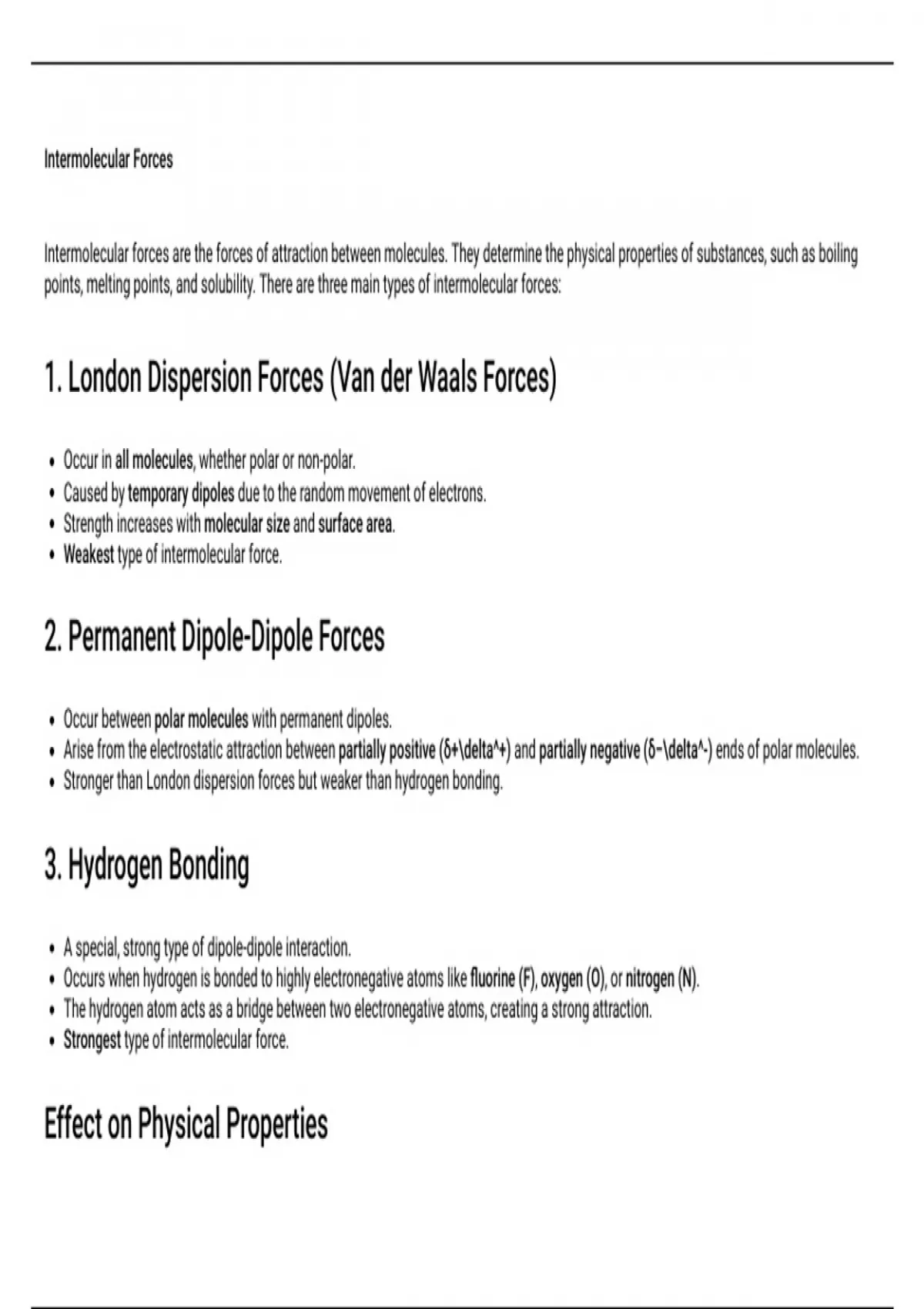 points, melting points, and solubility. There are three main types of intermolecular forces: