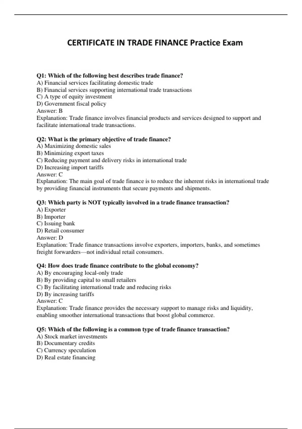 Explanation: Trade finance helps lower the risks associated with international trade, thereby