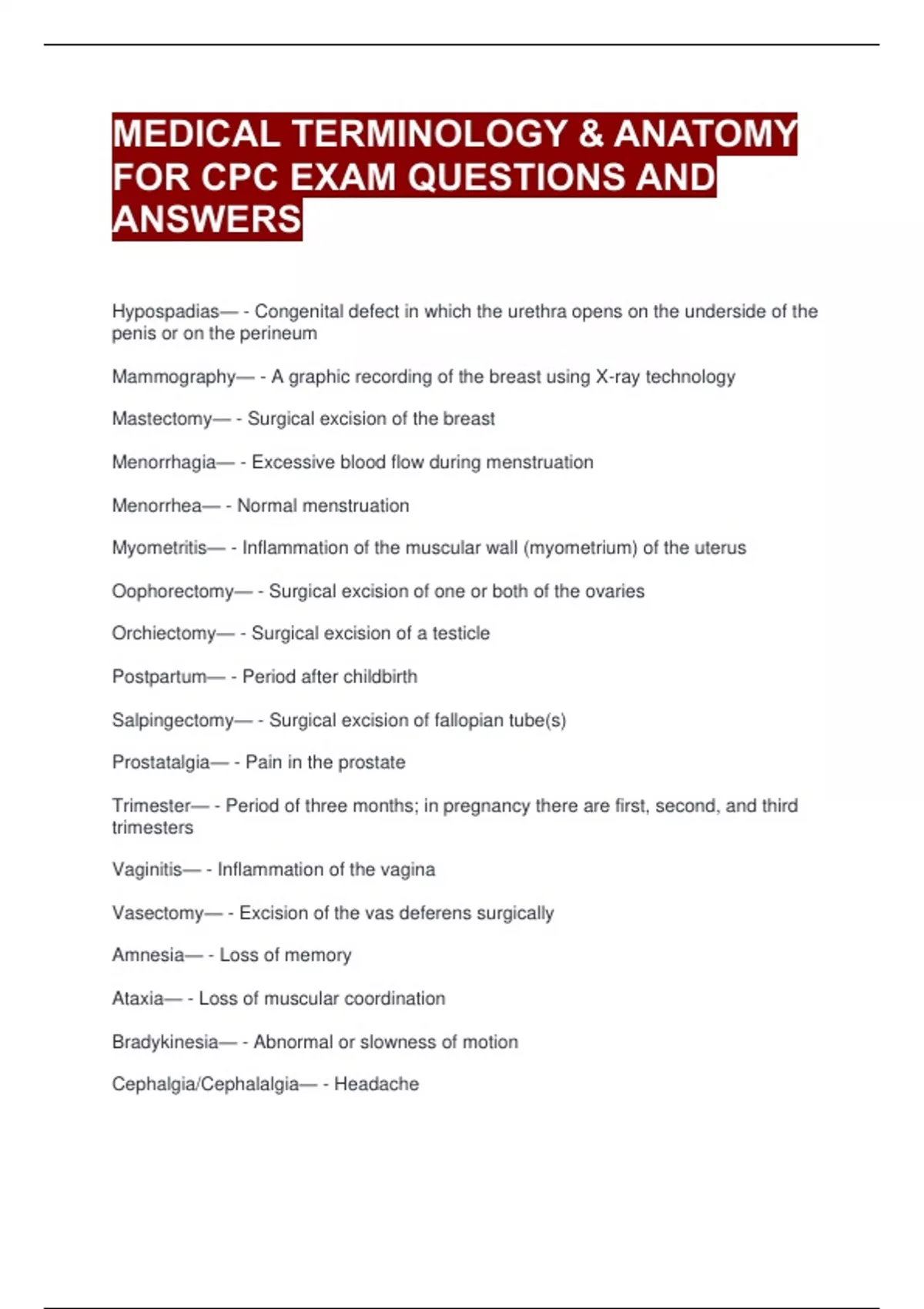 MEDICAL TERMINOLOGY & ANATOMY FOR CPC EXAM QUESTIONS AND ANSWERS